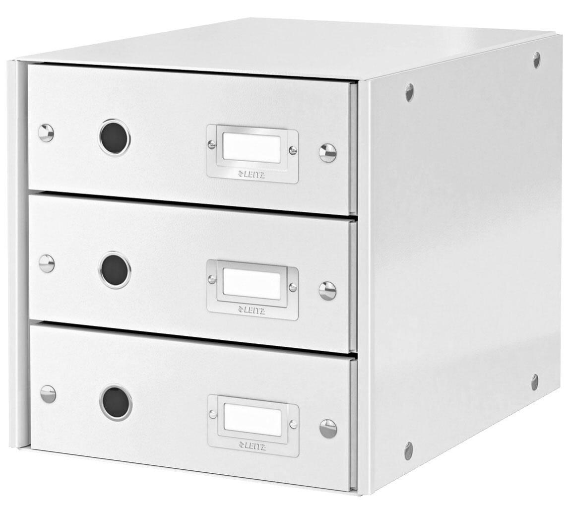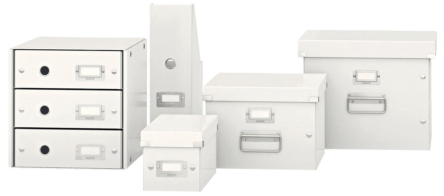 Die LEITZ Schubladenbox 60480001 ist die ideale Lösung für die ordentliche Aufbewahrung von Dokumenten und Büromaterialien im DIN A4 Format. Mit ihren kompakten Maßen von 29,0 x 36,0 x 28,3 cm passt sie perfekt auf jeden Schreibtisch oder in jedes Regal. Diese Schubladenbox überzeugt durch ihre ansprechende weiße Farbe, die in jedem Arbeitsumfeld für eine frische und moderne Optik sorgt. Die Schubladenbox ist aus robustem Karton mit einer Stärke von 1.500 g/qm gefertigt, was für eine hohe Stabilität und Langlebigkeit sorgt. Die geschlossenen Schubladen bieten nicht nur Schutz für deine Unterlagen, sondern verhindern auch das Eindringen von Staub. Mit drei praktischen Fächern kannst du deine Dokumente, Notizen und Büromaterialien übersichtlich sortieren und schnell darauf zugreifen. Ein besonderes Highlight dieser Schubladenbox ist die Ausführung, die mit einer Polypropylen-Folie kaschiert ist. Diese sorgt nicht nur für eine ansprechende Optik, sondern macht die Box auch widerstandsfähig gegen Feuchtigkeit und Verschmutzungen. Die praktischen Druckknöpfe ermöglichen ein einfaches und schnelles Aufbauen, sodass du die Box im Handumdrehen einsatzbereit hast. Die LEITZ Schubladenbox der Serie Click & Store ist nicht stapelbar, bietet jedoch ausreichend Platz für deine Unterlagen und ist somit die perfekte Ergänzung für dein Büro oder Homeoffice. Vertraue auf die Qualität von LEITZ und bringe Ordnung in deine Arbeitsumgebung mit dieser funktionalen und stilvollen Schubladenbox.Technische Daten