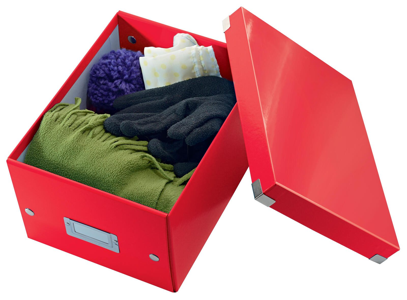 Die LEITZ Aufbewahrungsbox Click & Store in einem lebhaften Rot ist die ideale Lösung für die ordentliche Aufbewahrung deiner Unterlagen und persönlichen Gegenstände. Mit einem Fassungsvermögen von 7,4 Litern und den Außenmaßen von 21,6 x 28,2 x 16,0 cm bietet diese Box ausreichend Platz für DIN A5 quer Formate, Fotos und vieles mehr. Die durchdachte Konstruktion aus hochwertigem Karton sorgt nicht nur für Stabilität, sondern verleiht der Box auch ein ansprechendes Design, das in jedes Umfeld passt.