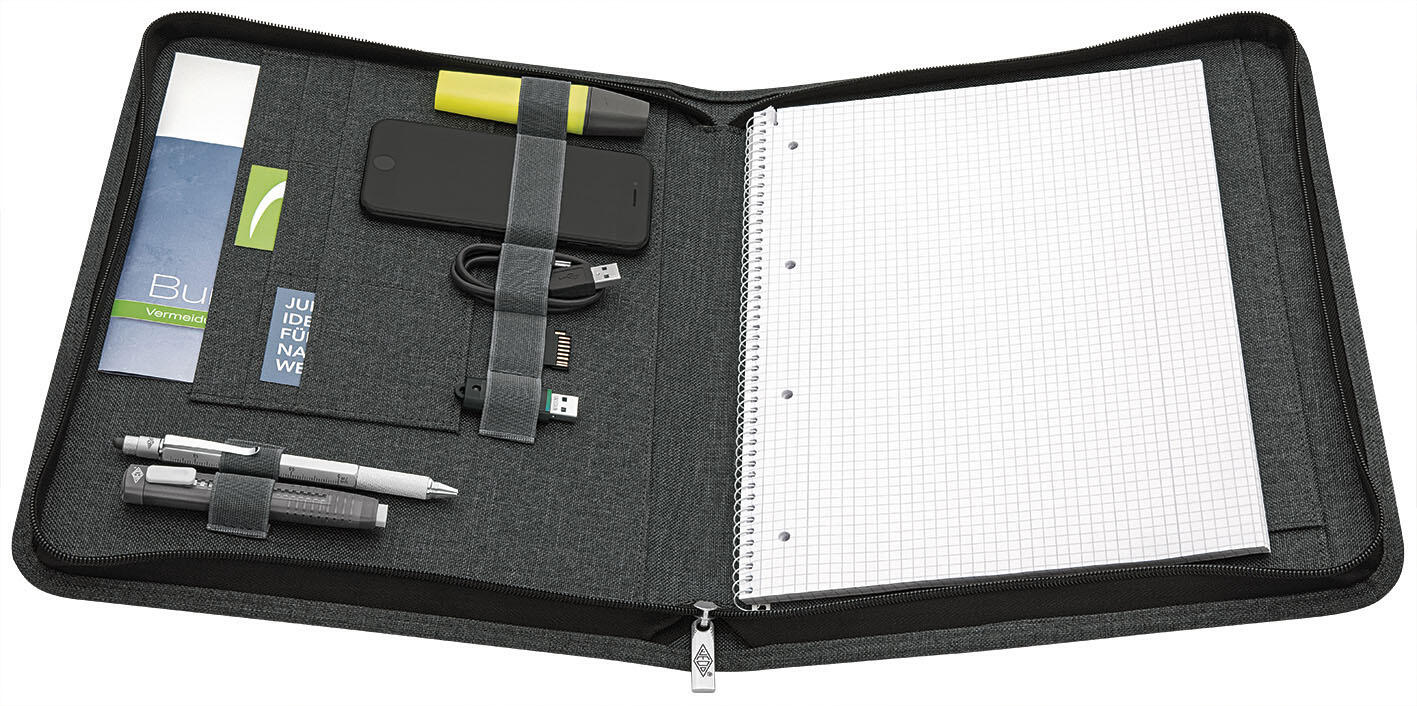 Die WEDO Konferenzmappe COLLEGE in elegantem Grau ist die perfekte Begleiterin für deine Meetings, Präsentationen und Konferenzen. Hergestellt aus hochwertigem Polyester, bietet sie nicht nur eine ansprechende Optik, sondern auch eine hohe Strapazierfähigkeit. Die Mappe ist speziell für DIN A4 Formate konzipiert und ermöglicht dir eine einfache Organisation deiner Unterlagen. Ein herausragendes Merkmal dieser Konferenzmappe ist der integrierte Stiftehalter, der dir stets schnellen Zugriff auf Schreibutensilien gewährleistet. So kannst du wichtige Notizen sofort festhalten, ohne nach einem Stift suchen zu müssen. Die Mappe verfügt über einen Blockeinschub, der von allen vier Seiten zugänglich ist, was sie sowohl für Rechts- als auch für Linkshänder äußerst benutzerfreundlich macht. Zudem bietet die WEDO Konferenzmappe COLLEGE zahlreiche Gummizugschlaufen, die es dir ermöglichen, deine Stifte und weitere Utensilien sicher zu verstauen. Mit insgesamt sechs Stifteschlaufen hast du genügend Platz für deine Lieblingsstifte, Marker oder andere Schreibgeräte. Dies sorgt nicht nur für Ordnung, sondern auch für einen professionellen Auftritt. Die schlichte und dennoch moderne Farbgestaltung in Grau macht die WEDO Konferenzmappe zu einem stilvollen Accessoire, das in jede Umgebung passt. Egal, ob im Büro, im Seminarraum oder bei einem wichtigen Geschäftstermin, diese Mappe wird dich nicht nur funktional unterstützen, sondern auch deinen persönlichen Stil unterstreichen. Die WEDO Konferenzmappe COLLEGE ist die ideale Wahl für alle, die Wert auf Qualität und Funktionalität legen.Technische Daten