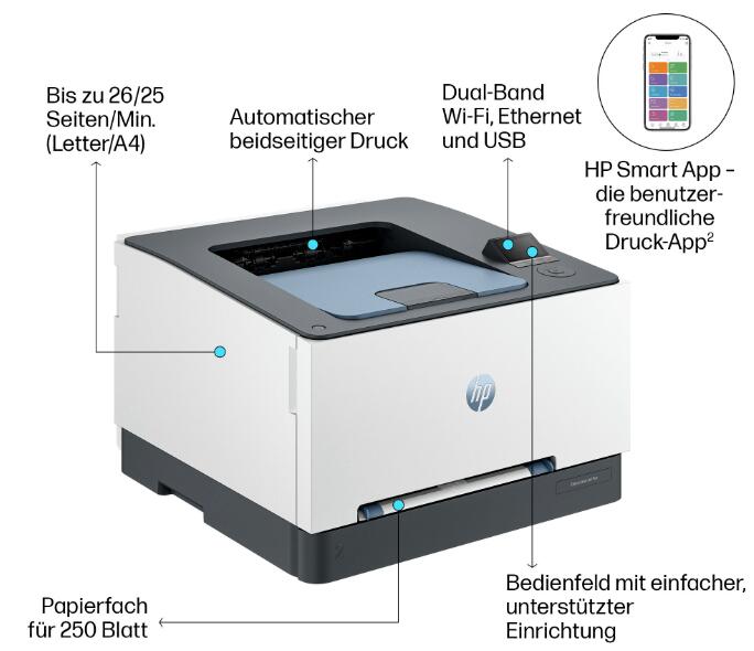 Konzipiert für Arbeitsgruppen, die professionelle Leistung mit schnellem, hochwertigem beidseitigem Farbdruck, Laserproduktivität und preisgekrönter Zuverlässigkeit in einem platzsparenden Design benötigen. Drucker mit dynamischer Sicherheit. Enthält Technologie, welche die Funktionalität von Druckerpatronen mit Chips oder Schaltkreisen anderer Hersteller als HP jetzt oder in Zukunft verhindern kann.