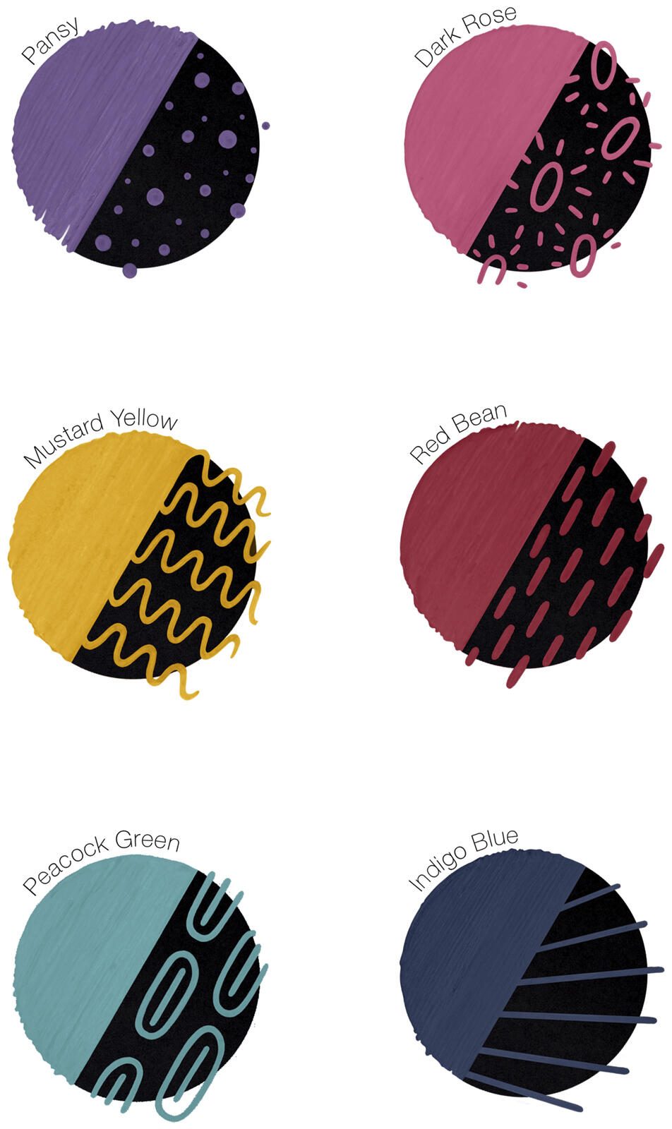 • Pansy, Dark Rose, Red Bean, Mustard Yellow, Peacock Green, Indigo Blue