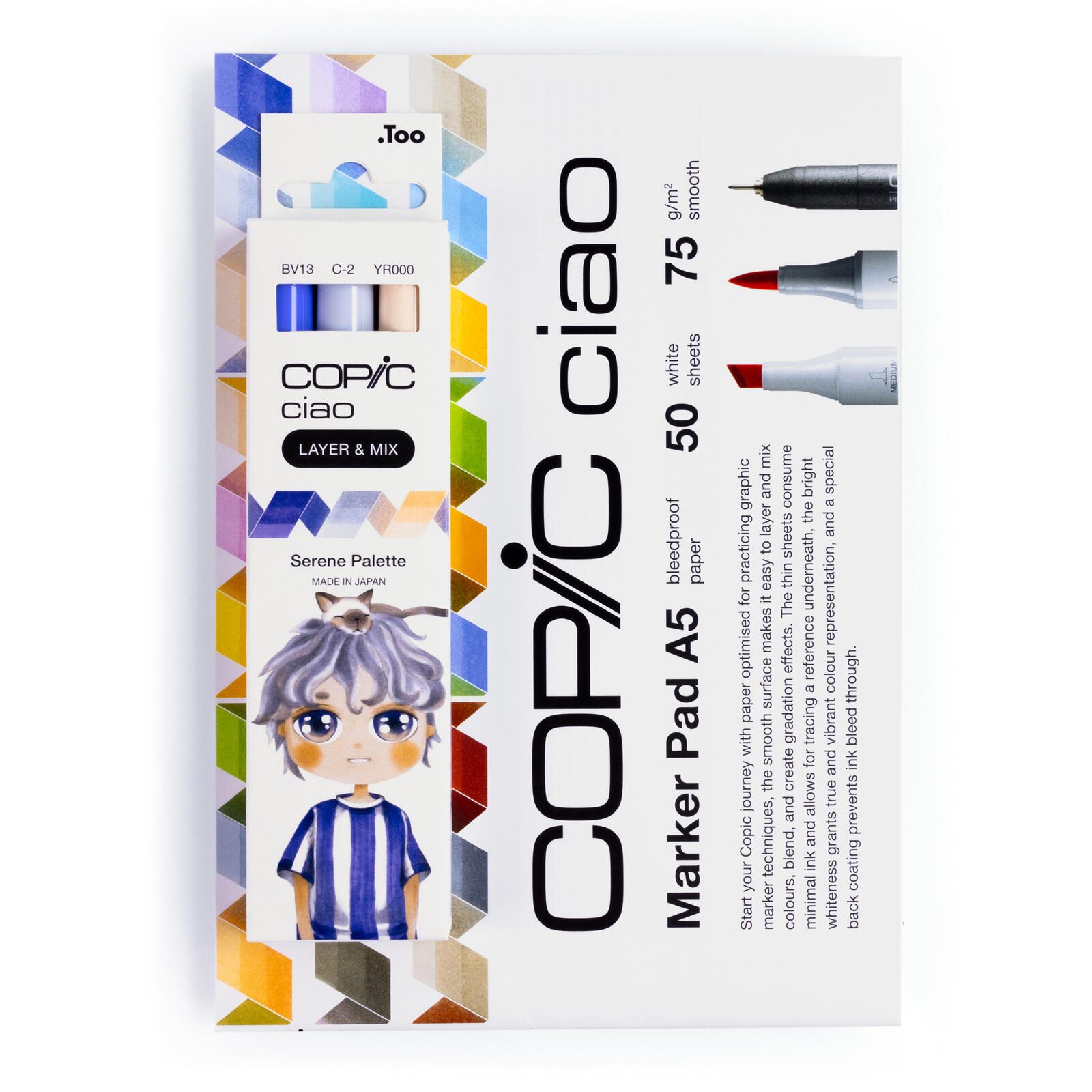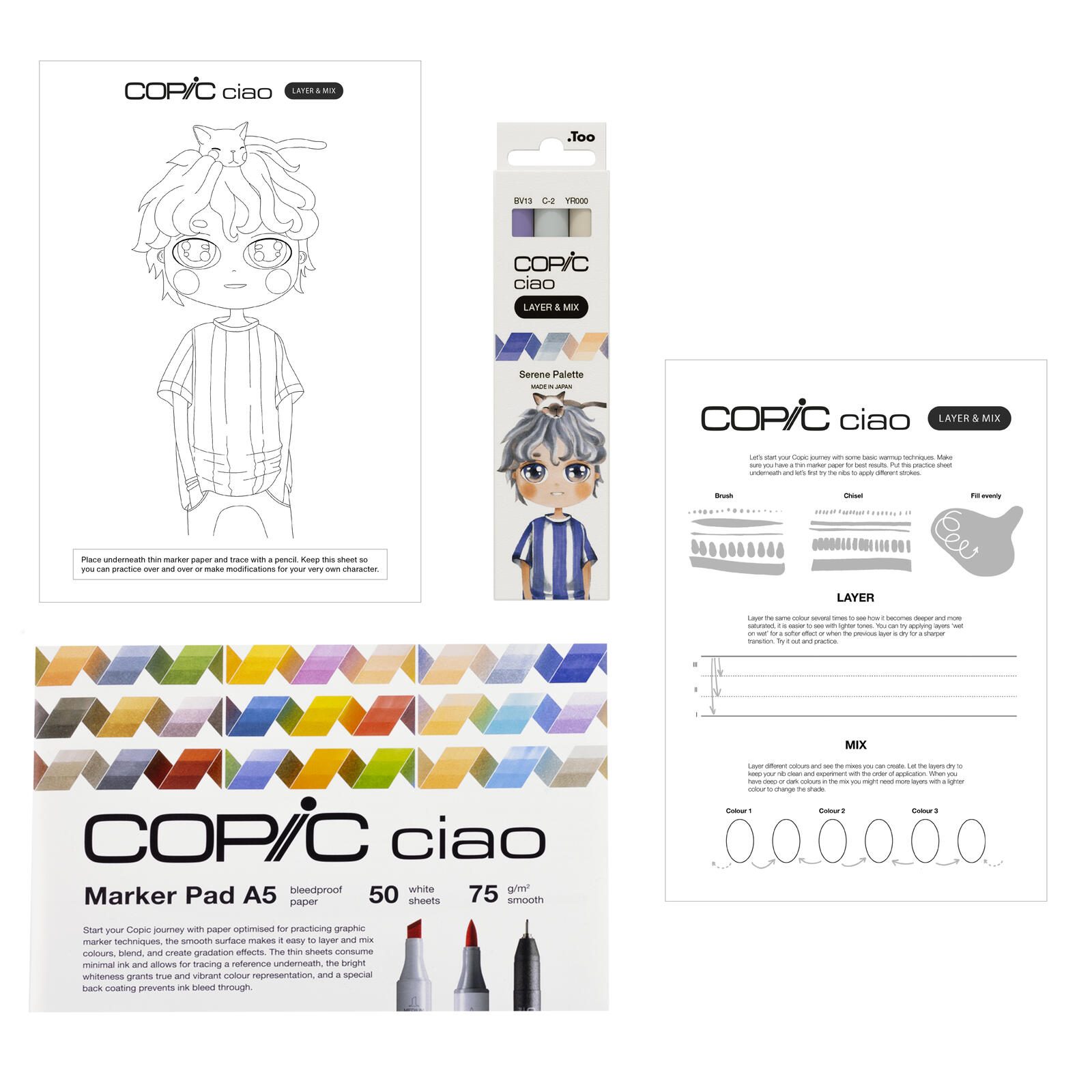 - Das Starter Set beinhaltet nur 3 Farben, mit denen durch Übereinanderlegen und Mischen insgesamt 12 Farbtöne kreiert werden können sowie 1 x Papierblock Copic Ciao Marker Pad A5, 1 x Line Art-Illustration zum Durchpausen sowie 1 x spezielles Übungsblatt