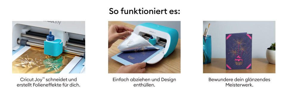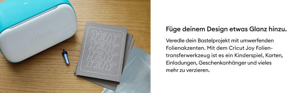 Verleihen Sie Ihren Cricut Joy Projekten einen Hauch von Glanz und Schimmer mit atemberaubenden Folienakzenten - denken Sie an Karten, Einladungen, Geschenkanhänger und mehr. Mit diesem einzigartigen Werkzeug erzielen Sie glänzende, polierte Ergebnisse auf Profi-Niveau. Mit den 12 mitgelieferten Folientransferblättern haben Sie alles, was Sie brauchen, um sofort wie ein Profi zu arbeiten. Folgen Sie einfach den Anweisungen in der Cricut Joy App oder im Design Space, und wenn Ihr Cricut Joy Gerät fertig ist, ziehen Sie es ab, um den Schimmer und Glanz zu enthüllen.