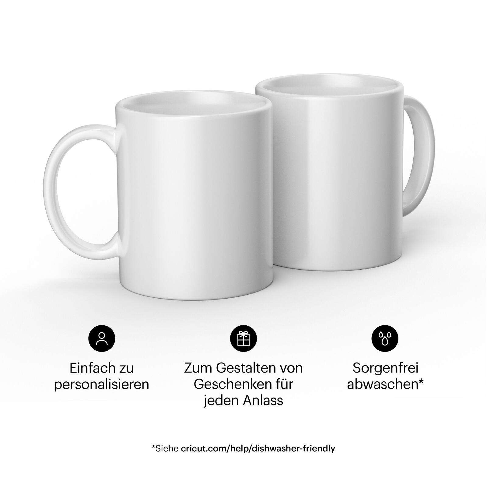 Profi-Tassen in Minutenschnelle. Dieses Set enthält 2 hochwertige Becherrohlinge und 2 einsatzbereite Schachteln. Mit einer glatten Keramikoberfläche und geraden Wänden lassen sich jedes Mal makellose Transfers erreichen. Verwende die Cricut Mug Press und Infusible Ink um Dinge mit einem Namen, Logo, Insiderwitz oder Lieblingszitat zu personalisieren. Im Gegensatz zum Aufbügeln oder Vinyl-Auftrag, bei denen das Kunstwerk mit Kleber auf einem Grundmaterial aufgetragen wird, wird die Infusible Ink Wärmetransferfolie eins mit der Tasse. The results are permanent, seamlessly smooth – and dishwasher & microwave safe.* Carefully follow instructions at cricut.com/make-mugs.