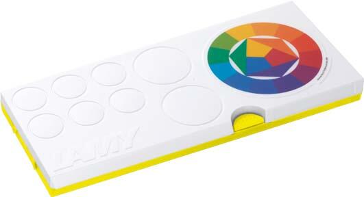 Der LAMY Deckfarbkast neonyellow 12er enthält ein Farbsortiment in den Farbtönen schwarz, braun, ocker, hellgrün, grün, blau, türkis, lila, rosa, rot, orange und gelb. Dieser Wasserfarbkasten ist nach DIN 5023 zertifiziert und beinhaltet den bekannten Farbkreis nach Johannes Itten. Mit der Serienbezeichnung aquaplus gelb bietet dieser Deckfarbkasten hochwertige Farben in einer handlichen Box.