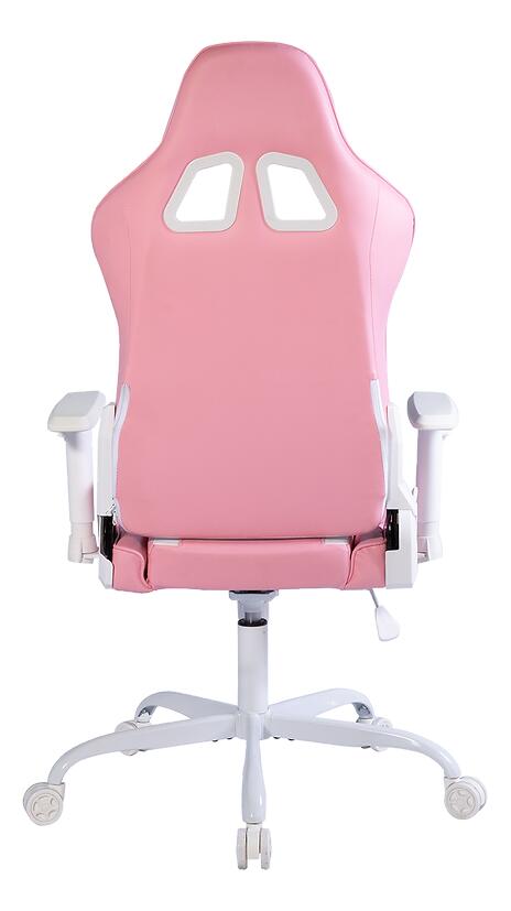 Gaming-Stuhl aus stylischem rosa Kunstleder mit ergonomischen Ähnlichkeiten zu einem Rennstuhl.