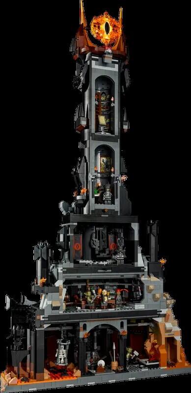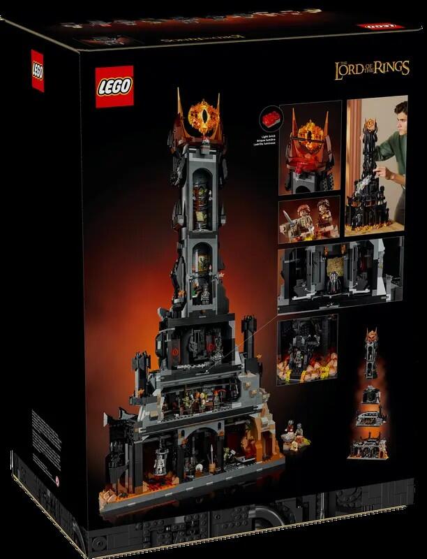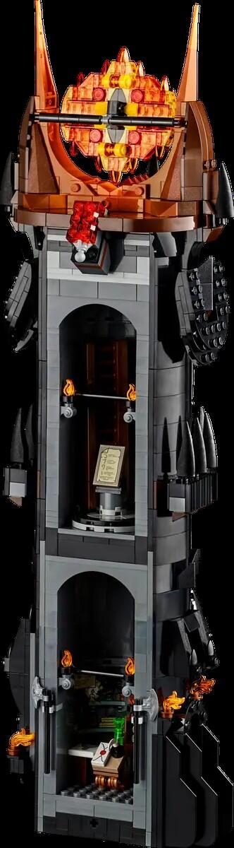 Im Erdgeschoss verbergen sich Gollums™ Versteck, eine Waffenschmiede und ein Kerker mit hochziehbarem Orkkäfig. Über dem Speisesaal im 1. Obergeschoss befindet sich eine Kammer mit Thron, der sich öffnen lässt, um eine Karte von Mittelerde preiszugeben. Das 3. Obergeschoss beherbergt das Studierzimmer von Saurons Mund. Und im 4. Obergeschoss befindet sich die Turmbibliothek mit drehbarer Leiter. Das automatisierte schwarze Tor und Saurons leuchtendes Auge machen das Modell zu einem noch spektakuläreren Hingucker.
