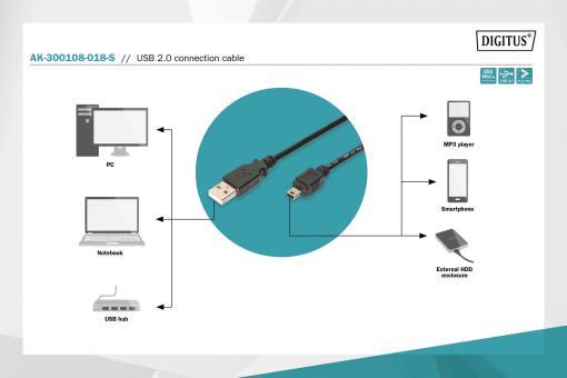Zum Anschluss externer USB Endgeräte (mit Mini B (5-Pin) Buchse, z. B. MP3-Player, Smartphone oder externes Festplattengehäuse) an den USB-Host (z. B. PC, Notebook oder USB-Hub). Übertragungsrate bis zu 480 Mbps (High-Speed).