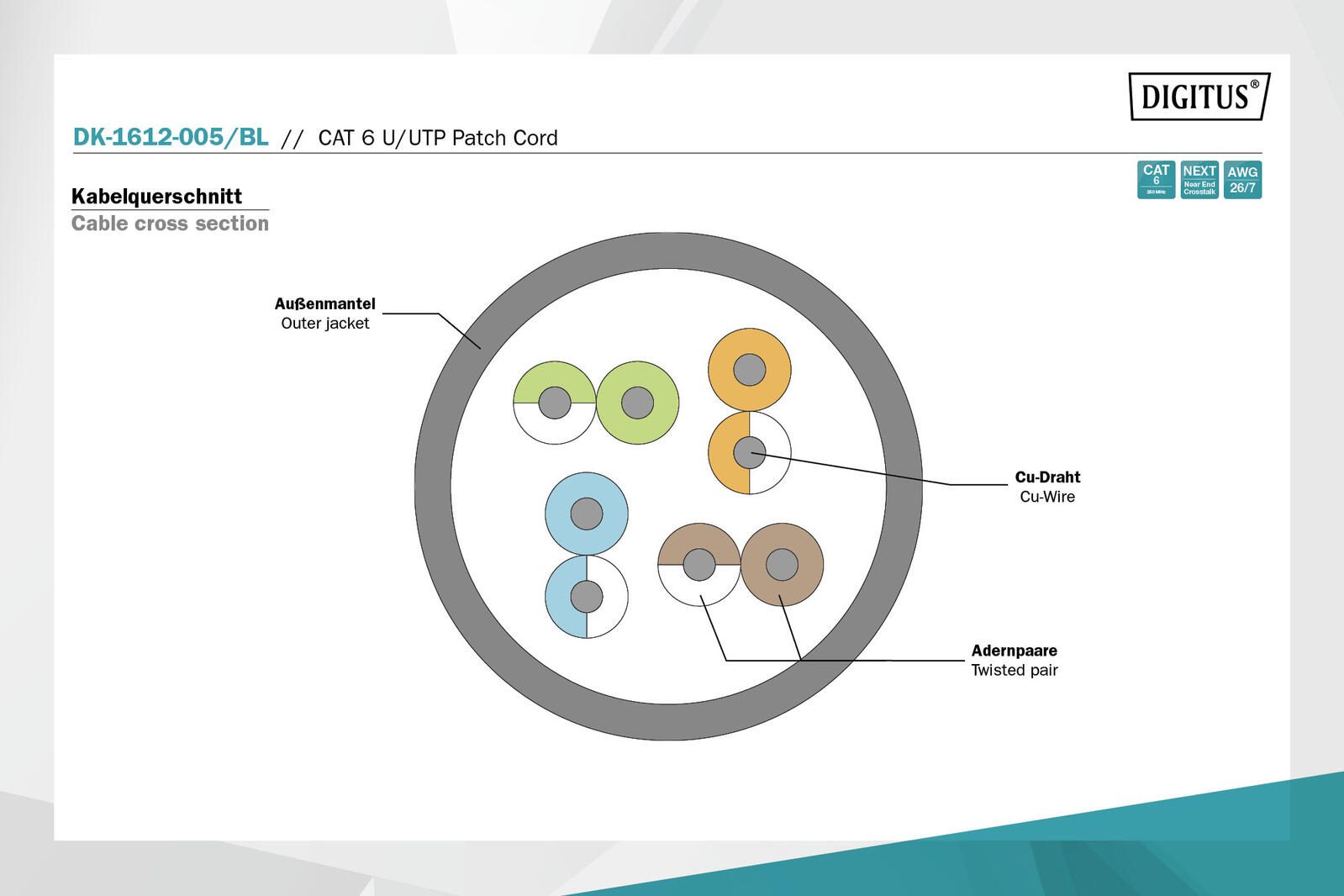 Die DIGITUS® Kategorie 6 Klasse E Patchkabel werden hergestellt und getestet nach dem ISO/IEC 11801 und DIN EN 50173 CAT 6 Standard. Sie garantieren, dass die Kabelinstallation der ISO & EN Channel Spezifikation entspricht und bieten eine hervorragende Leistung in der DIGITUS® CAT 6 Verkabelung. Die Leistung wurde bis 250 MHz getestet, inklusive Leistungseigenschaften wie beispielsweise dem Nahnebensprechen („NEXT“). Die DIGITUS® Patchkabel wurden speziell entwickelt um allen Ansprüchen in den verschiedenen Anwendungsbereichen in vollem Umfang gerecht zu werden. Jedes Kabel ist mit einer angespritzten Knickschutztülle mit Zugentlastung ausgestattet. Außerdem besitzt die Tülle einen Rasthebelschutz, welcher das Verhaken der Kabel sowie das Abbrechen des Rasthebels vom Stecker verhindert. Eine einfache Identifizierung der Kategorie 6 wird durch die rote Einfärbung der Stecker ermöglicht.