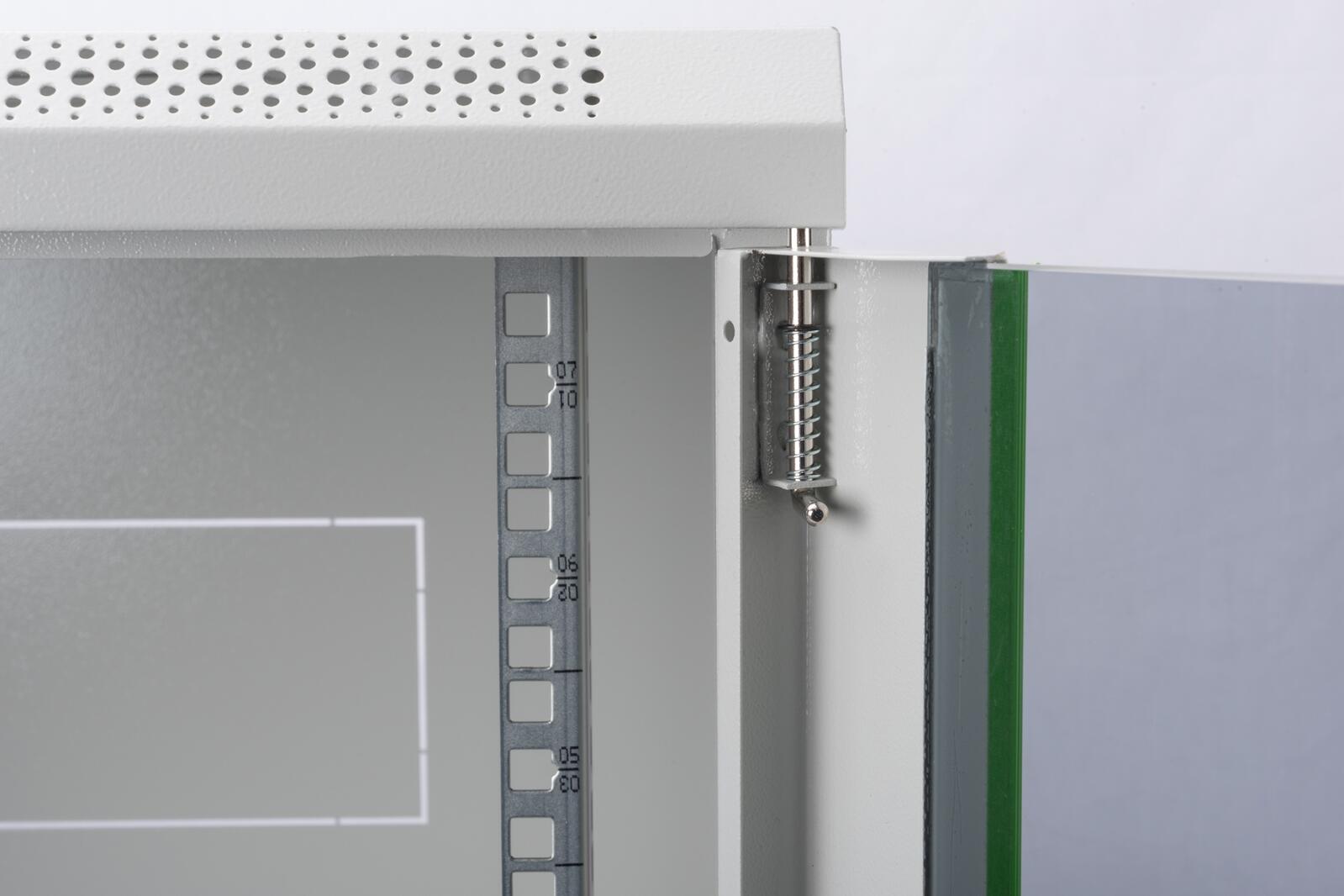 Die Netzwerkschränke zur Wandmontage der Dynamic Serie wurden für einen einfachen und besonders kostenoptimierten Netzwerkausbau entwickelt. Dach, Boden und Rückwand eines jeden Schrankes sind mit einem vorgestanzten Kabeleinlass ausgestattet. Für die Aufnahme eines Lüftermoduls wird das Dachchassis ebenfalls mit einem ausgestanzten Bereich versehen. Zwei Paar galvanisierte, mit in beide Richtungen ablesbare Höheneinheiten beschriftete 483 mm (19")-Profilschienen sind im Inneren verbaut. Diese lassen sich in der Tiefe verstellen. Jeder Schrank ist eine robuste Stahlkonstruktion aus bis zu 1,5 mm starkem Stahlblech. Die Farbgebung erfolgt in Form von elektrostatischer Pulverbeschichtung in den Standardfarben Grau (RAL 7035) und Schwarz (RAL 9005). Abnehmbare Seitenwände sowie die abschließ- und abnehmbare Fronttür, verbessern die Zugänglichkeit. Ein Türanschlagswechsel kann vorgenommen werden. Die Wandmontage erfolgt in zwei einfachen Arbeitsschritten: Das mitgelieferte Montageblech wird an die Wand geschraubt und im Anschluss mit dem Gehäuse verbunden.
