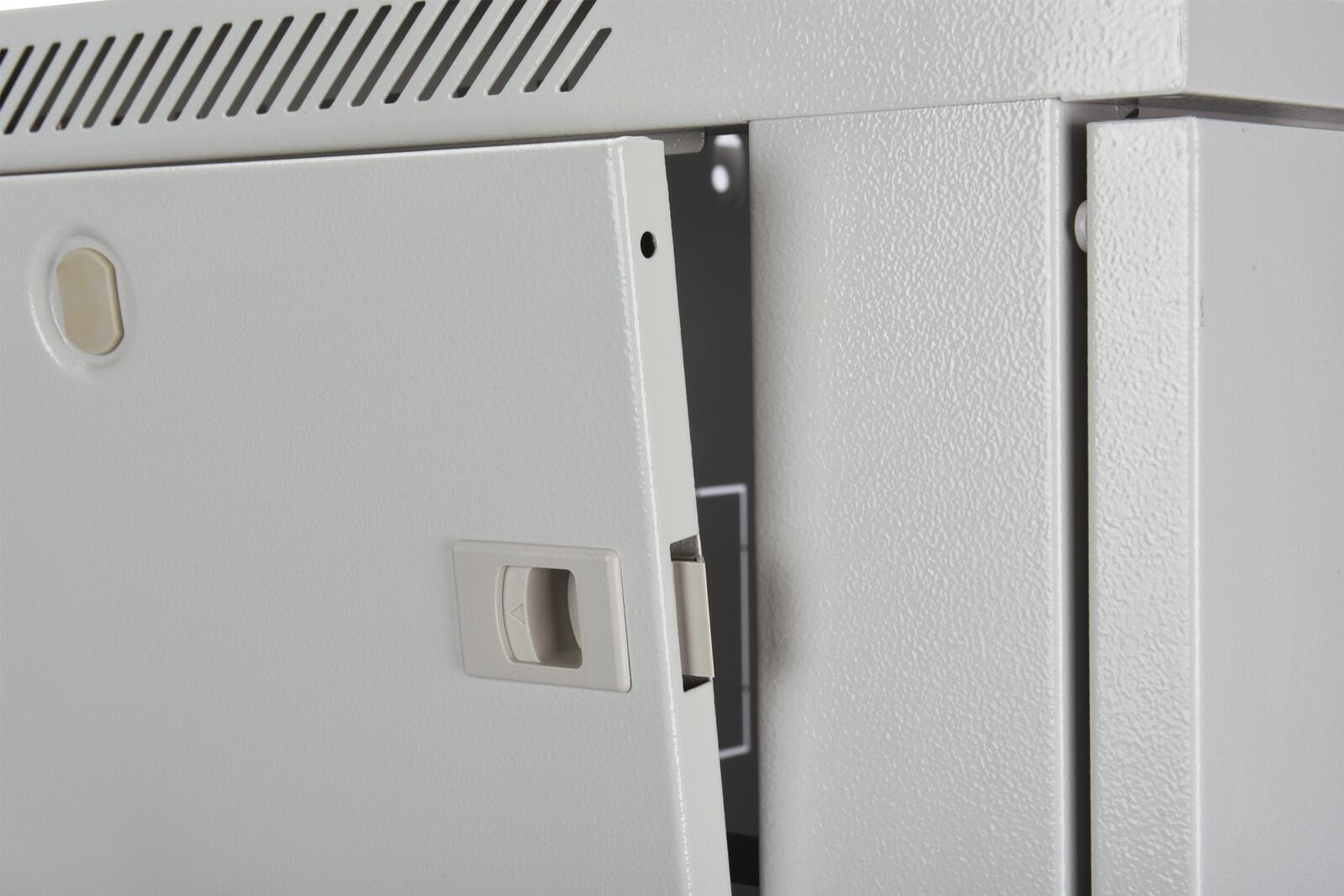 Die Netzwerkschränke zur Wandmontage der Dynamic Serie wurden für einen einfachen und besonders kostenoptimierten Netzwerkausbau entwickelt. Dach, Boden und Rückwand eines jeden Schrankes sind mit einem vorgestanzten Kabeleinlass ausgestattet. Für die Aufnahme eines Lüftermoduls wird das Dachchassis ebenfalls mit einem ausgestanzten Bereich versehen. Zwei Paar galvanisierte, mit in beide Richtungen ablesbare Höheneinheiten beschriftete 483 mm (19")-Profilschienen sind im Inneren verbaut. Diese lassen sich in der Tiefe verstellen. Jeder Schrank ist eine robuste Stahlkonstruktion aus bis zu 1,5 mm starkem Stahlblech. Die Farbgebung erfolgt in Form von elektrostatischer Pulverbeschichtung in den Standardfarben Grau (RAL 7035) und Schwarz (RAL 9005). Abnehmbare Seitenwände sowie die abschließ- und abnehmbare Fronttür, verbessern die Zugänglichkeit. Ein Türanschlagswechsel kann vorgenommen werden. Die Wandmontage erfolgt in zwei einfachen Arbeitsschritten: Das mitgelieferte Montageblech wird an die Wand geschraubt und im Anschluss mit dem Gehäuse verbunden.