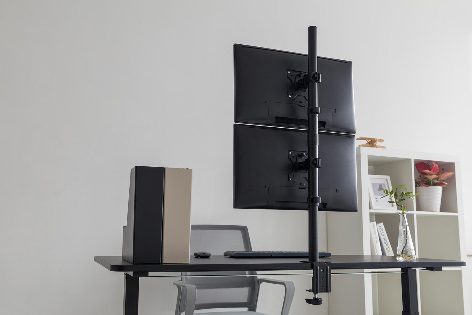 Die Desktophalterung bietet Ihnen die Möglichkeit zwei Monitore von bis 32" / 8 kg vertikal, übereinander zu montieren. Schwenken, Drehen sowie Neigen der Monitore wird durch die Halterung ermöglicht. Die Quick-Release-Funktion (Schnellverschluss) - ermöglicht schnelles Anbringen oder Entfernen der Monitore. Die Halterung bietet zwei Montageoptionen: sowohl Tischklemme als auch Durchführungs-Stange sind im Lieferumfang enthalten.