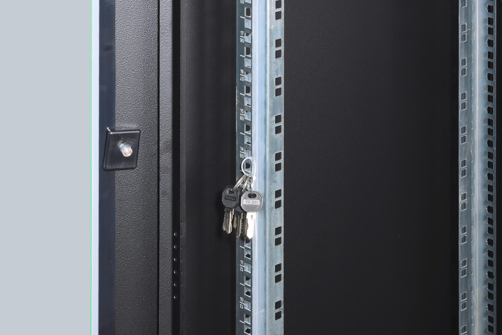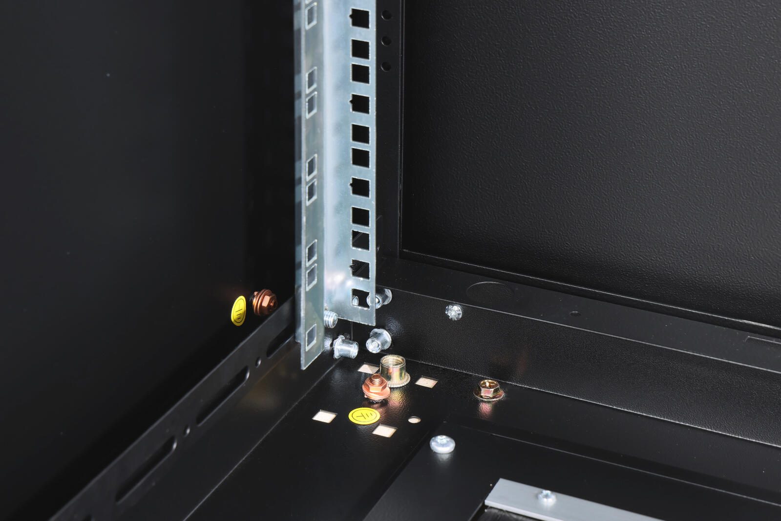 Die Netzwerkschränke der Unique Serie wurden für eine besonders komfortable und flexible Netzwerkverkabelung designt und produziert. Durchdachte Optimierungen bieten marktkonforme Stabilität bei maximaler Flexibilität. Ein modular, durch verschraubte 483 mm (19")-Blindplatten öffenbares Bodenchassis bietet ausreichend Platz für Kabel aller Art. Rückseitige Bürstenleisten ober- und unterhalb der Rücktür (ab 26HE), ermöglichen den Einsatz bei verschiedensten Anwendungsszenarien. Großzügige vertikale Kabelkanäle mit Kabelführungshilfen und Blende, verbaut in der Frontseite (ab 800 mm Schrankbreite), runden die vielfältigen Eigenschaften des Netzwerkschranks einwandfrei ab. Zwei Paar verkröpfte und galvanisch verzinkte, mit gegenläufig ablesbaren Höheneinheiten beschriftete 483 mm (19")-Profilschienen sind im Inneren verbaut. Sie lassen sich stufenlos verstellen und sind mit zusätzlichen Tiefenstreben im Schrank verbunden. Jeder Schrank ist eine robuste Stahlkonstruktion aus bis zu 1,5 mm starkem Stahlblech. Die Farbgebung erfolgt in Form von elektrostatischer Pulverbeschichtung in den Standardfarben Grau (RAL 7035) und Schwarz (RAL 9005). Modular abschließ- und abnehmbare Seitenwände sowie Türen verbessern die Zugänglichkeit. Ein Türanschlagswechsel kann vorgenommen werden. Des Weiteren sind die Schränke auf Grund der zerlegbaren Konstruktion bei Bedarf komplett demontierbar.
