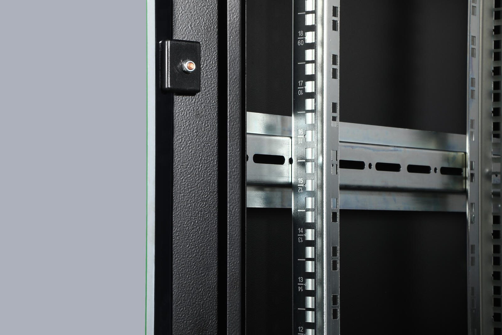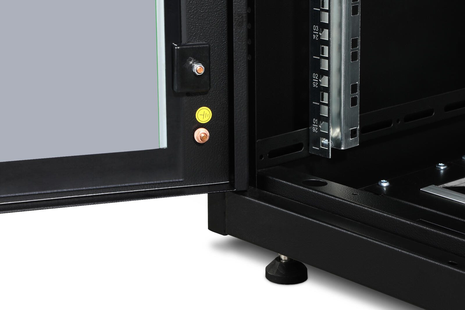 Abschließbare Rücktüre, verschließbare Seitenwand, Glastür, Bürstenleiste, integrierte Kabelführung, Kabeleingang, höhenverstellbare Füße, Verriegelungsdrehgriff, einstelbare Tiefenschienen