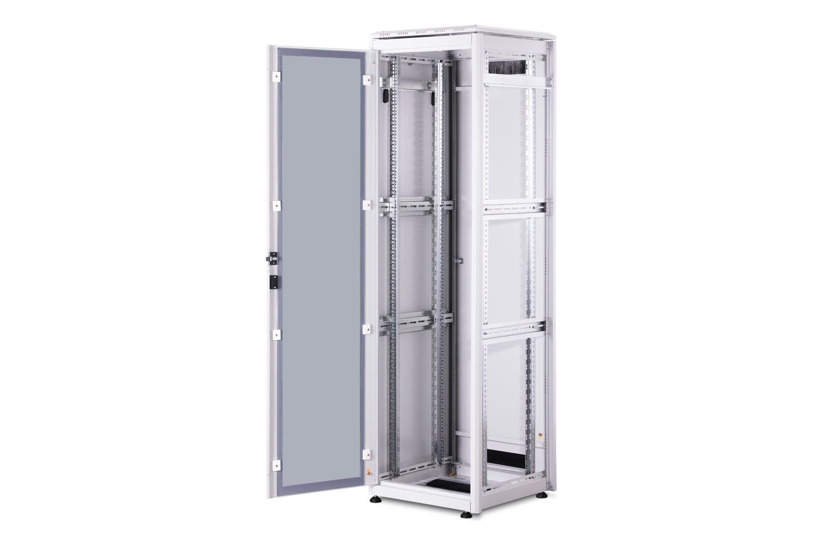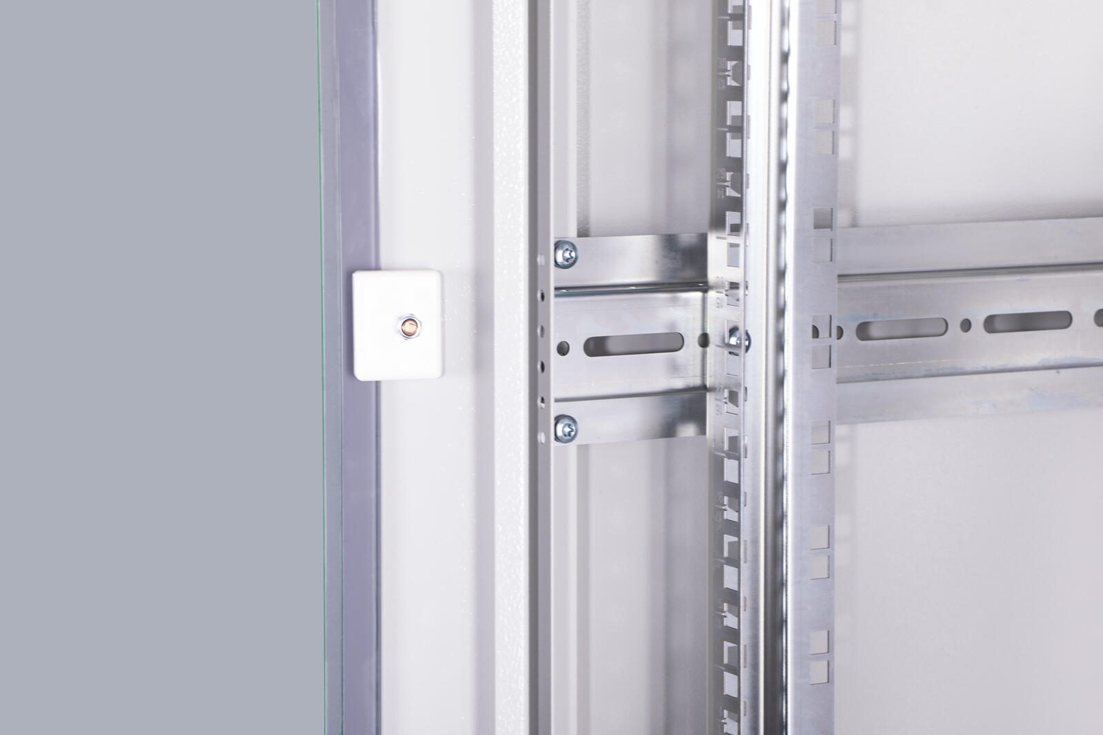 Die Netzwerkschränke der Unique Serie wurden für eine besonders komfortable und flexible Netzwerkverkabelung designt und produziert. Durchdachte Optimierungen bieten marktkonforme Stabilität bei maximaler Flexibilität. Ein modular, durch verschraubte 483 mm (19")-Blindplatten öffenbares Bodenchassis bietet ausreichend Platz für Kabel aller Art. Darüber hinaus befinden sich Kabeleinlässe mit Bürste im hinteren Bereich des Bodenchassis. Rückseitige Bürstenleisten ober- und unterhalb der Rücktür (ab 26HE), ermöglichen den Einsatz bei verschiedensten Anwendungsszenarien. Großzügige vertikale Kabelkanäle mit Kabelführungshilfen und Blende, verbaut in der Frontseite (ab 800 mm Schrankbreite), runden die vielfältigen Eigenschaften des Netzwerkschranks einwandfrei ab. Zwei Paar verkröpfte und galvanisch verzinkte, mit gegenläufig ablesbaren Höheneinheiten beschriftete 483 mm (19")-Profilschienen sind im Inneren verbaut. Sie lassen sich stufenlos verstellen und sind mit zusätzlichen Tiefenstreben im Schrank verbunden. Jeder Schrank ist eine robuste Stahlkonstruktion aus bis zu 1,5 mm starkem Stahlblech. Die Farbgebung erfolgt in Form von elektrostatischer Pulverbeschichtung in den Standardfarben Grau (RAL 7035) und Schwarz (RAL 9005). Modular abschließ- und abnehmbare Seitenwände sowie Türen verbessern die Zugänglichkeit. Ein Türanschlagswechsel kann vorgenommen werden. Des Weiteren sind die Schränke auf Grund der zerlegbaren Konstruktion bei Bedarf komplett demontierbar.