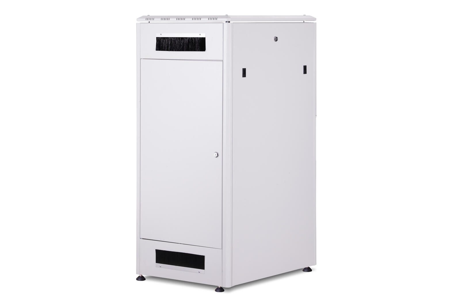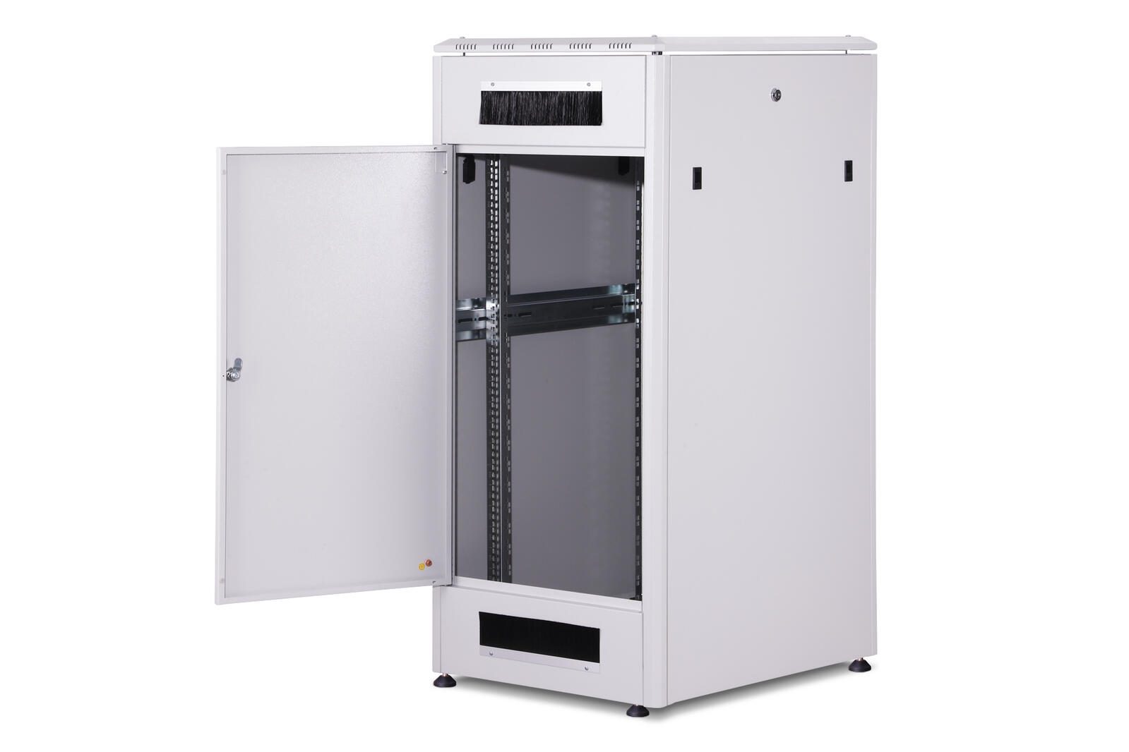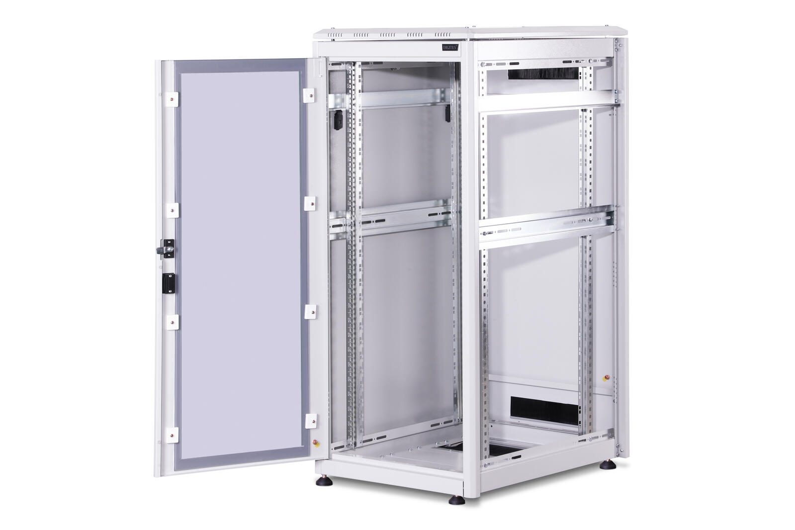 Die Netzwerkschränke der Unique Serie wurden für eine besonders komfortable und flexible Netzwerkverkabelung designt und produziert. Durchdachte Optimierungen bieten marktkonforme Stabilität bei maximaler Flexibilität. Ein modular, durch verschraubte 483 mm (19")-Blindplatten öffenbares Bodenchassis bietet ausreichend Platz für Kabel aller Art. Darüber hinaus befinden sich Kabeleinlässe mit Bürste im hinteren Bereich des Bodenchassis. Rückseitige Bürstenleisten ober- und unterhalb der Rücktür (ab 26HE), ermöglichen den Einsatz bei verschiedensten Anwendungsszenarien. Großzügige vertikale Kabelkanäle mit Kabelführungshilfen und Blende, verbaut in der Frontseite (ab 800 mm Schrankbreite), runden die vielfältigen Eigenschaften des Netzwerkschranks einwandfrei ab. Zwei Paar verkröpfte und galvanisch verzinkte, mit gegenläufig ablesbaren Höheneinheiten beschriftete 483 mm (19")-Profilschienen sind im Inneren verbaut. Sie lassen sich stufenlos verstellen und sind mit zusätzlichen Tiefenstreben im Schrank verbunden. Jeder Schrank ist eine robuste Stahlkonstruktion aus bis zu 1,5 mm starkem Stahlblech. Die Farbgebung erfolgt in Form von elektrostatischer Pulverbeschichtung in den Standardfarben Grau (RAL 7035) und Schwarz (RAL 9005). Modular abschließ- und abnehmbare Seitenwände sowie Türen verbessern die Zugänglichkeit. Ein Türanschlagswechsel kann vorgenommen werden. Des Weiteren sind die Schränke auf Grund der zerlegbaren Konstruktion bei Bedarf komplett demontierbar.