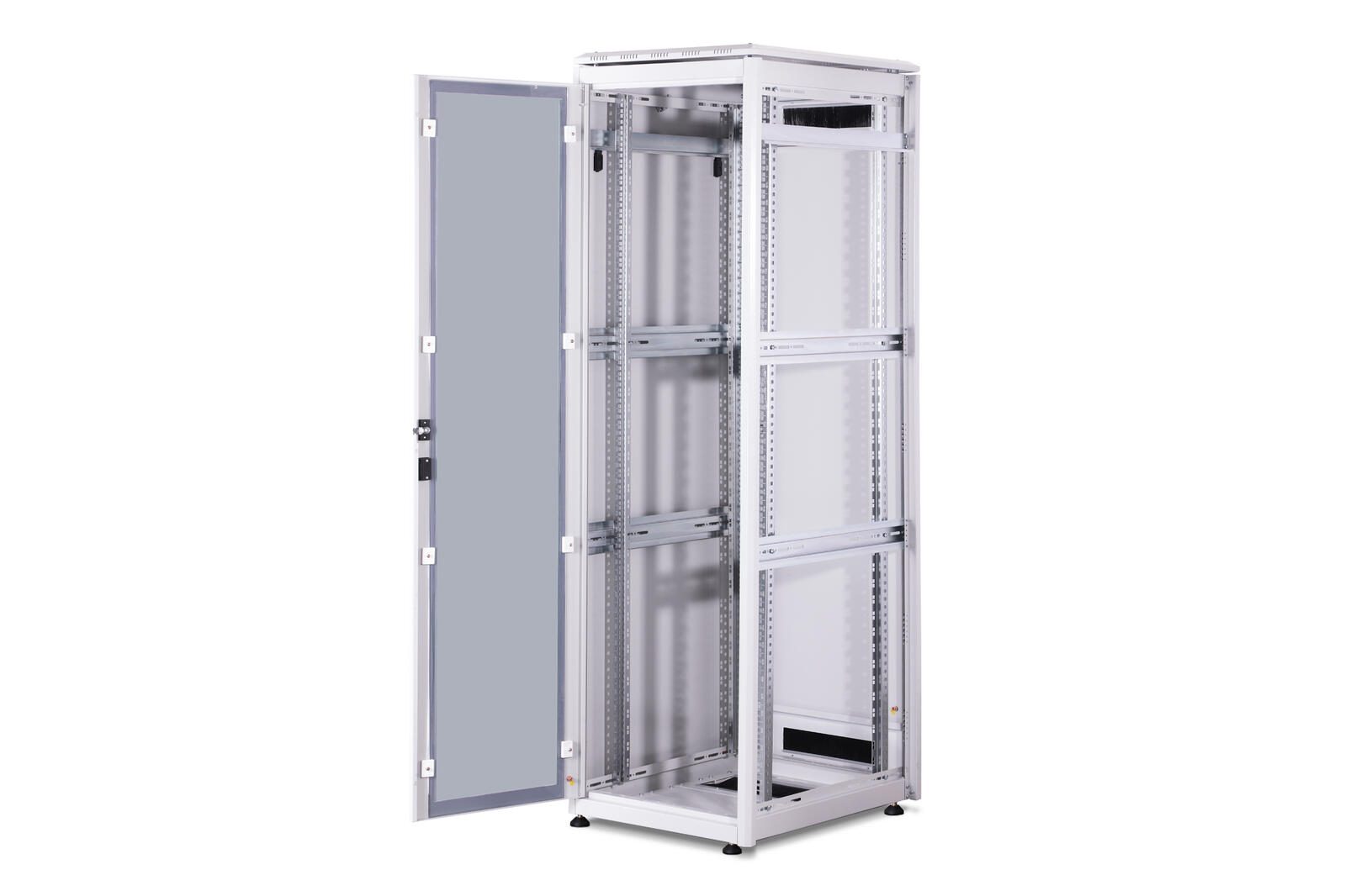 Abschließbare Rücktüre, verschließbare Seitenwand, Glastür, Schwenkgriff, verstellbare Schienen, oben und unten Kabeleingangspunkte