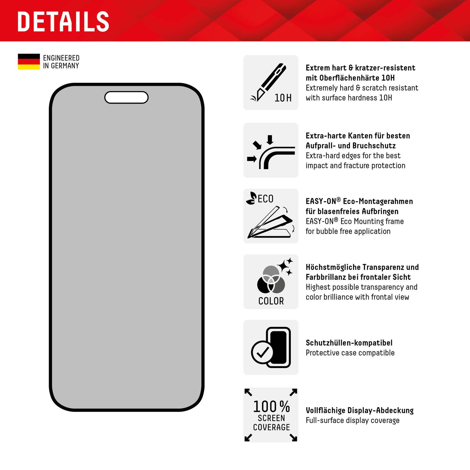 - Kratzer-resistent: Das gehärtete Glas (Oberflächenhärte 10H) schützt wirkungsvoll vor Kratzern.