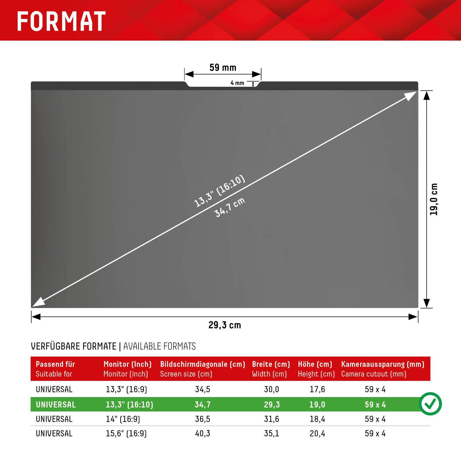 - Für Laptop/ Notebook 13,3'' (16:10), BxH: 29,3 x 19 cm, Diagonale: 34,7