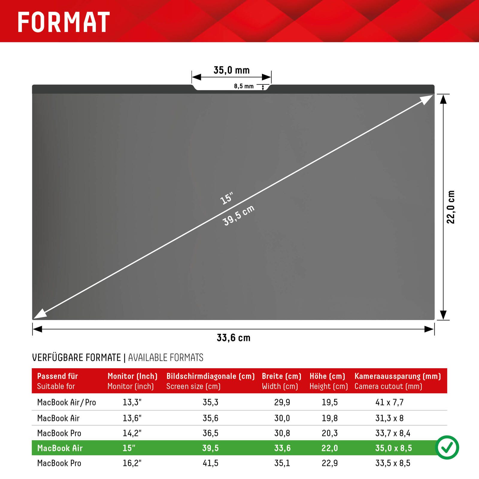 - Für MacBook Air 15‘‘, BxH: 33,6 x 22 cm, Diagonale: 39,5