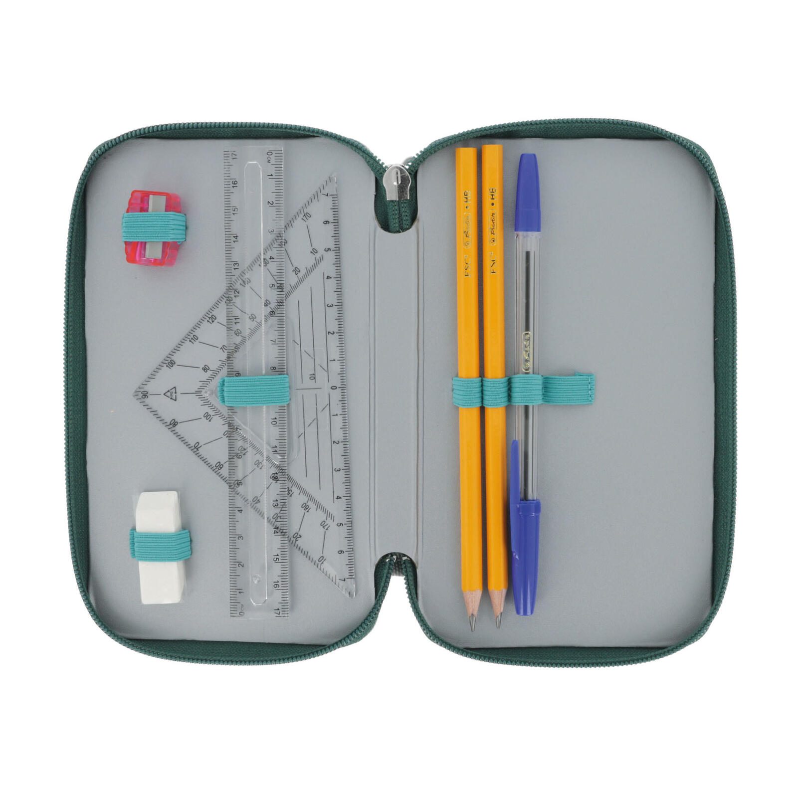 • 8 Fasermaler, 8 Buntstifte triangular, 2 Bleistifte triangular, 1 Anspitzer, 1 Radiergummi, 1 Lineal 16 cm, 1 Geodreieck, 1 Kugelschreiber