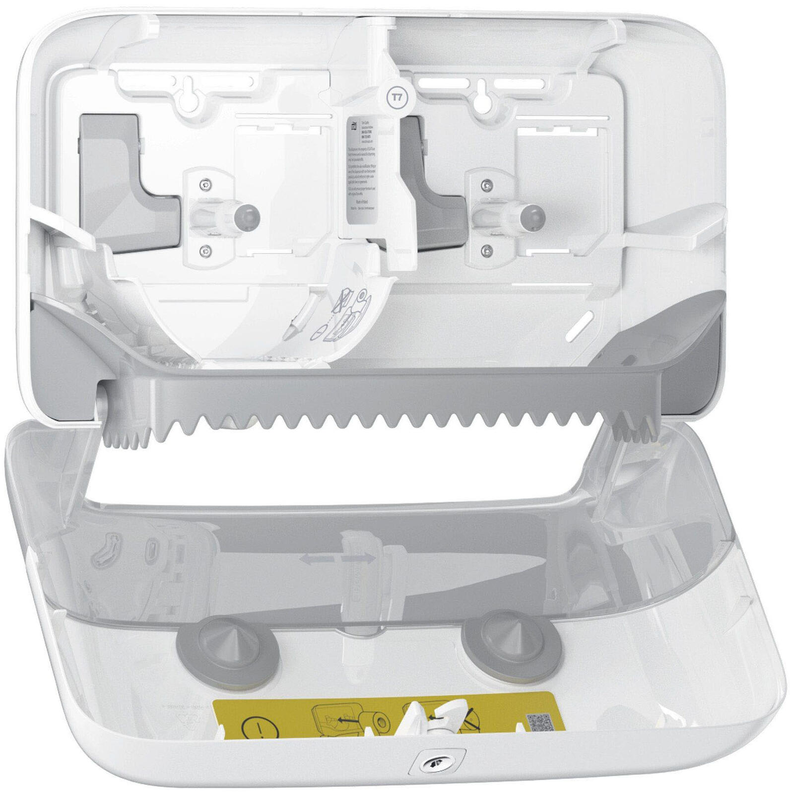 Der TORK Toilettenpapierspender in elegantem Weiß ist die perfekte Lösung für eine hygienische und praktische Handhabung von Toilettenpapier. Mit einem Fassungsvermögen für zwei Rollen ist dieser Spender ideal für viel frequentierte Bereiche und sorgt dafür, dass stets ausreichend Papier zur Verfügung steht. Dieser Doppelrollenspender ist speziell für die Wandmontage konzipiert und lässt sich problemlos in verschiedenen Umgebungen installieren. Die abschließbare Funktion bietet zusätzlichen Schutz und Sicherheit, sodass der Inhalt vor unbefugtem Zugriff geschützt ist. Besonders hervorzuheben ist die Möglichkeit der Außenabrollung, die eine einfache und benutzerfreundliche Entnahme des Papiers ermöglicht. Hergestellt aus robustem Kunststoff, ist der TORK Toilettenpapierspender nicht nur langlebig, sondern auch leicht zu reinigen und zu pflegen. Mit den Außenmaßen von 36,0 x 13,0 x 20,7 cm passt er in nahezu jede Umgebung, sei es in öffentlichen Toiletten, Büros oder Gastronomiebetrieben. Der Spender ist für Kleinrollen und Toilettenpapier geeignet, was ihn zu einer flexiblen Wahl für unterschiedliche Bedürfnisse macht. Die schlichte weiße Farbe fügt sich harmonisch in jedes Badezimmerdesign ein und sorgt für einen modernen und gepflegten Eindruck. Mit diesem TORK Toilettenpapierspender investierst du in eine praktische und stilvolle Lösung für deine sanitären Einrichtungen, die sowohl Funktionalität als auch Ästhetik vereint.Technische Daten