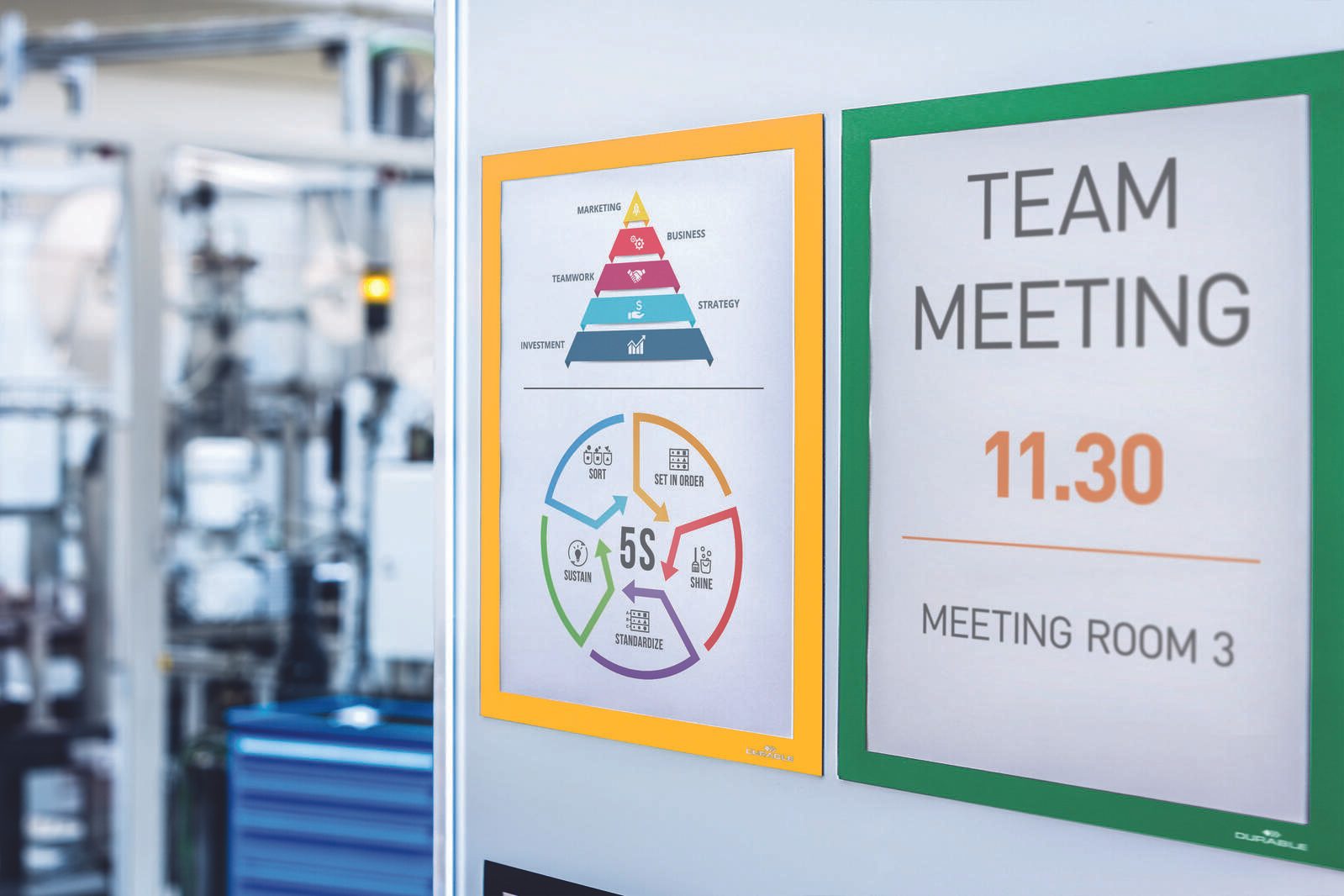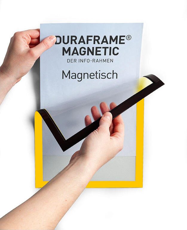 Der DURABLE Magnetrahmen A4 in leuchtendem Gelb vereint Funktionalität und ansprechendes Design. Er ist die ideale Lösung, um wichtige Informationen, Notizen oder kreative Arbeiten auf allen eisenhaltigen Flächen wie Whiteboards oder Stahlschränken sichtbar zu präsentieren. Mit seiner Öffnung an der Unter- und Seitenkante ermöglicht dieser Magnetrahmen ein müheloses Einlegen und Austauschen von Dokumenten, was dir Flexibilität und Effizienz im Arbeitsalltag bietet. Die Verwendung von antireflektierender Hartfolie sorgt dafür, dass deine Inhalte klar und deutlich sichtbar bleiben, ohne störende Lichtreflexionen. Dies ist besonders vorteilhaft in gut beleuchteten Büros oder Besprechungsräumen, wo eine optimale Lesbarkeit entscheidend ist. Der Magnetrahmen ist nicht nur praktisch, sondern auch robust, sodass du dich auf eine langfristige Nutzung verlassen kannst. Mit einem Pack von fünf Magnetrahmen erhältst du ein hervorragendes Preis-Leistungs-Verhältnis, das dir ermöglicht, mehrere Bereiche gleichzeitig zu organisieren. Die auffällige gelbe Farbe bringt einen frischen Akzent in dein Büro oder Arbeitsumfeld und sorgt dafür, dass deine Informationen ins Auge fallen. Der DURABLE Magnetrahmen ist somit nicht nur ein praktisches Hilfsmittel, sondern auch ein stilvolles Accessoire, das deine Präsentationen aufwertet. Egal, ob du im Büro, in der Schule oder zu Hause arbeitest, dieser Magnetrahmen ist vielseitig einsetzbar und unterstützt dich dabei, deine Gedanken und Ideen strukturiert und ansprechend zu präsentieren. Mit dem DURABLE Magnetrahmen A4 in Gelb wird das Organisieren und Kommunizieren von Informationen zum Kinderspiel.Technische Daten