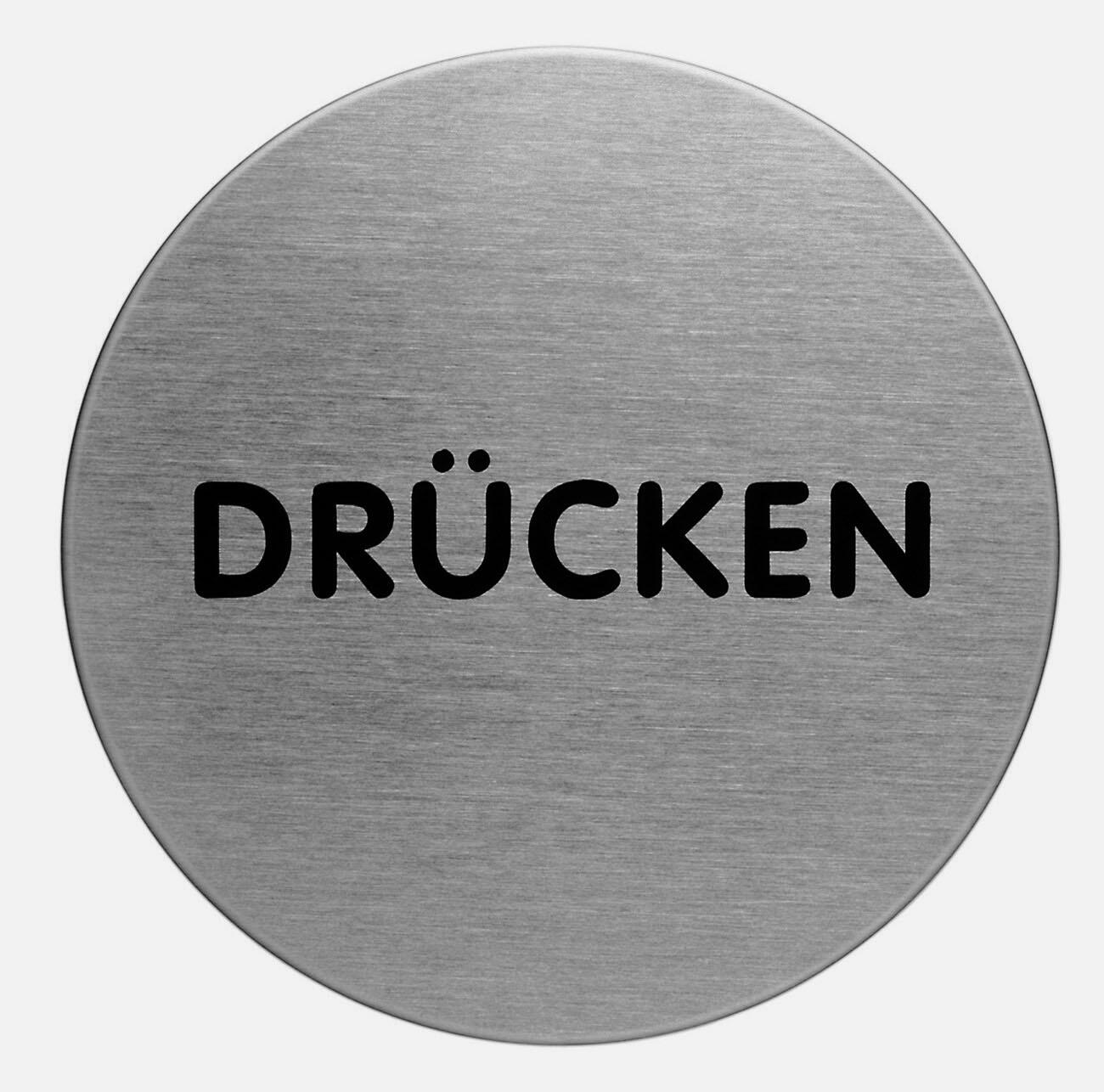 Das DURABLE Piktogramm Drücken in silberner Farbe zeichnet sich durch seine runde Form und die klare Aufschrift "Drücken" aus. Dieses selbstklebende Hinweisschild aus hochwertigem Edelstahl eignet sich ideal für den Innenbereich.
