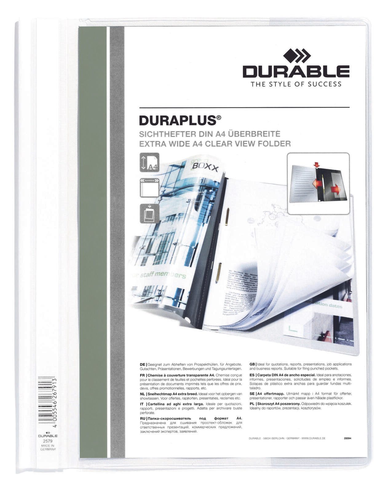 Der DURABLE Präsentationshefter für DIN A4 überbreit in elegantem Weiß ist die perfekte Lösung für alle, die ihre Dokumente stilvoll und sicher präsentieren möchten. Mit seiner transparenten Vorderseite bietet dieser Hefter nicht nur einen ansprechenden Blickfang, sondern schützt auch deine Unterlagen vor Schmutz und Beschädigungen. Die praktische Innentasche ermöglicht es, zusätzliche Blätter oder lose Notizen mühelos zu verstauen, während das Fassungsvermögen von ca. 200 Blatt sicherstellt, dass du ausreichend Platz für umfangreiche Präsentationen oder Berichte hast. Hergestellt aus hochwertiger PVC-Folie, ist dieser Präsentationshefter nicht nur langlebig, sondern auch leicht zu reinigen, was ihn zu einem idealen Begleiter im Büro, in der Schule oder bei Präsentationen macht. Mit einer überbreiten Ausführung ist dieser Hefter speziell für DIN A4 Formate konzipiert, sodass du auch größere Dokumente problemlos unterbringen kannst. Die schlichte weiße Farbe sorgt dafür, dass der Hefter in jedem Umfeld professionell wirkt und sich harmonisch in dein Büro oder deine Präsentationsunterlagen einfügt. Der DURABLE Präsentationshefter ist in praktischen Packungen zu je 25 Stück erhältlich, sodass du immer genügend Vorrat hast, um deine Unterlagen ordentlich zu organisieren. Ob für Präsentationen, Meetings oder persönliche Projekte, dieser Hefter verbindet Funktionalität mit ansprechendem Design und ist somit eine wertvolle Ergänzung für jeden, der Wert auf Ordnung und Stil legt.Technische Daten