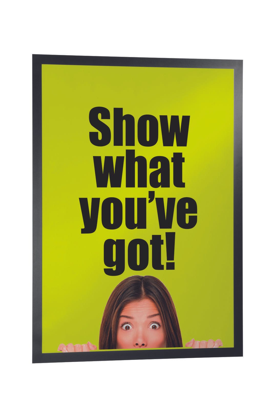 Unter der Serienbezeichnung DURAFRAME von Hersteller DURABLE geführt, ist der Rahmen speziell für Formate im DIN A1-Format konzipiert. Damit kannst du mühelos Poster, Hinweise oder Werbematerialien präsentieren und jederzeit flexibel austauschen.
