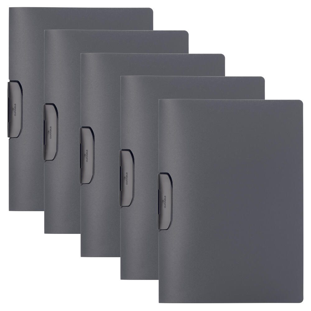 Der DURABLE Klemmhefter Duraswing DIN A4 in elegantem Anthrazit ist die ideale Lösung für die übersichtliche Ablage und Präsentation von Dokumenten im Format DIN A4. Mit einem Füllvermögen von bis zu 30 Blatt bietet dieser Klemmhefter ausreichend Platz für deine wichtigsten Unterlagen, sei es für die Schule, das Büro oder private Zwecke. Gefertigt aus hochwertigem Polypropylen (PP) überzeugt der Duraswing nicht nur durch seine ansprechende Optik, sondern auch durch seine Langlebigkeit und Robustheit. Das Material ist widerstandsfähig gegenüber Abnutzung und schützt deine Dokumente optimal vor äußeren Einflüssen. Die Vorder- und Rückseite des Hefters sind aus demselben strapazierfähigen Material gefertigt, was für ein einheitliches Erscheinungsbild sorgt. Ein besonderes Merkmal des Duraswing ist die praktische Klemme aus Kunststoff, die einen schnellen Zugriff auf deine Unterlagen ermöglicht und gleichzeitig für einen sicheren Halt sorgt. Die dezente Farbgebung in Anthrazit verleiht dem Klemmhefter eine professionelle Note und passt perfekt in jedes Arbeitsumfeld. Im Lieferumfang sind 5 Stück enthalten, sodass du ausreichend Material zur Verfügung hast, um verschiedene Projekte oder Themen zu organisieren. Der DURABLE Klemmhefter Duraswing ist nicht nur funktional, sondern auch ein stilvolles Accessoire für jeden, der Wert auf Ordnung und Ästhetik legt. Mit diesem Klemmhefter hast du eine praktische und ansprechende Möglichkeit, deine Dokumente zu präsentieren und zu schützen.Technische Daten