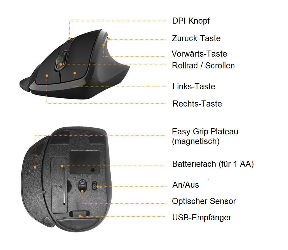 - Lieferung inkl.: Batterie, USB-Empfänger, Easy Grip Plateau (magnetisch)