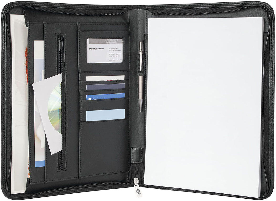 Mit einem integrierten Stiftehalter und einem Schreibblock ausgestattet, bietet die ELEGANCE Konferenzmappe alles, was du benötigst, um deine Notizen ordentlich zu halten und jederzeit griffbereit zu haben. Der Stiftehalter ermöglicht es dir, deinen Lieblingsstift sicher zu verstauen, sodass du immer bereit bist, wichtige Informationen festzuhalten. Die Mappe ist speziell für DIN A4 Formate konzipiert, was sie ideal für Präsentationen, Besprechungen oder Konferenzen macht.