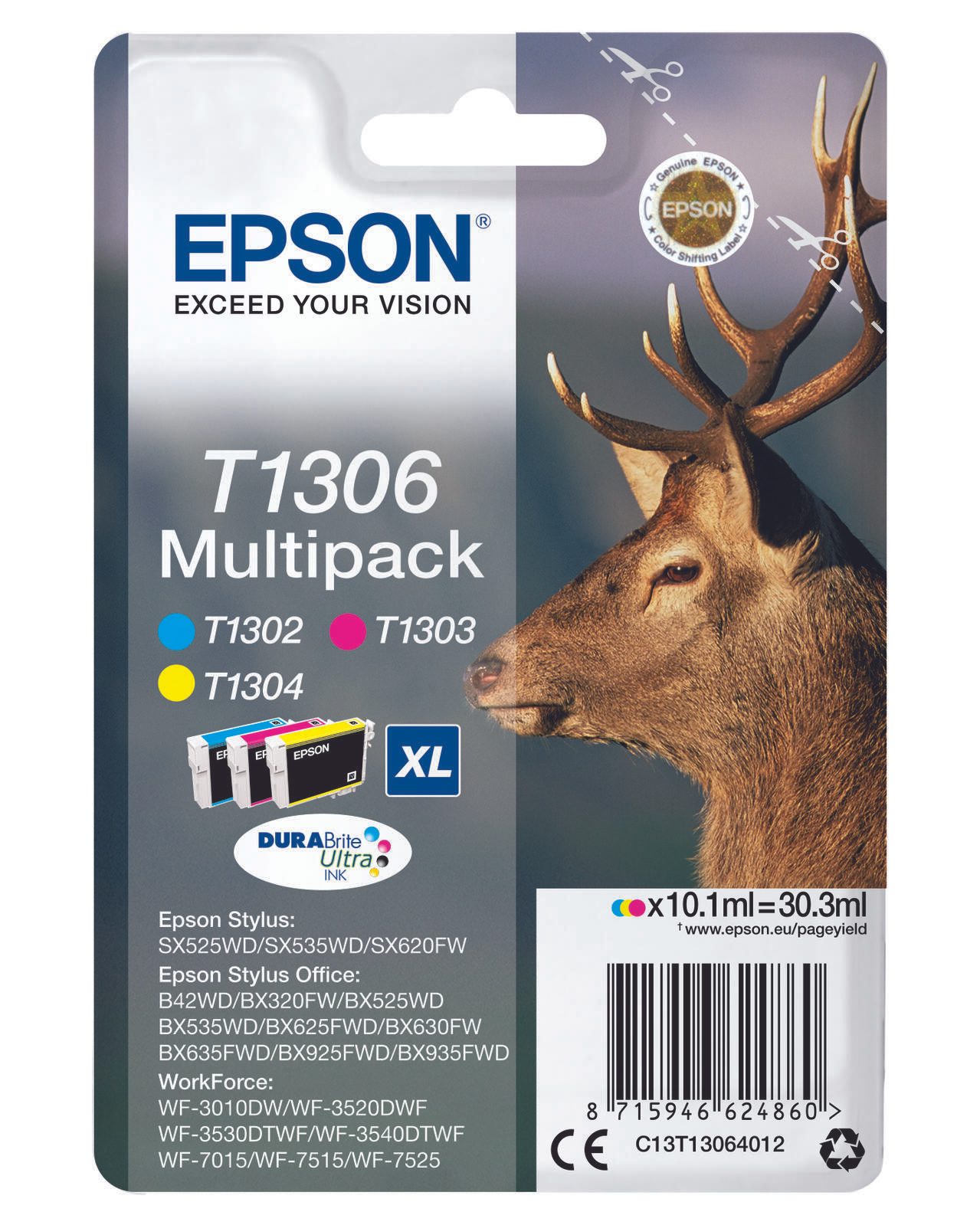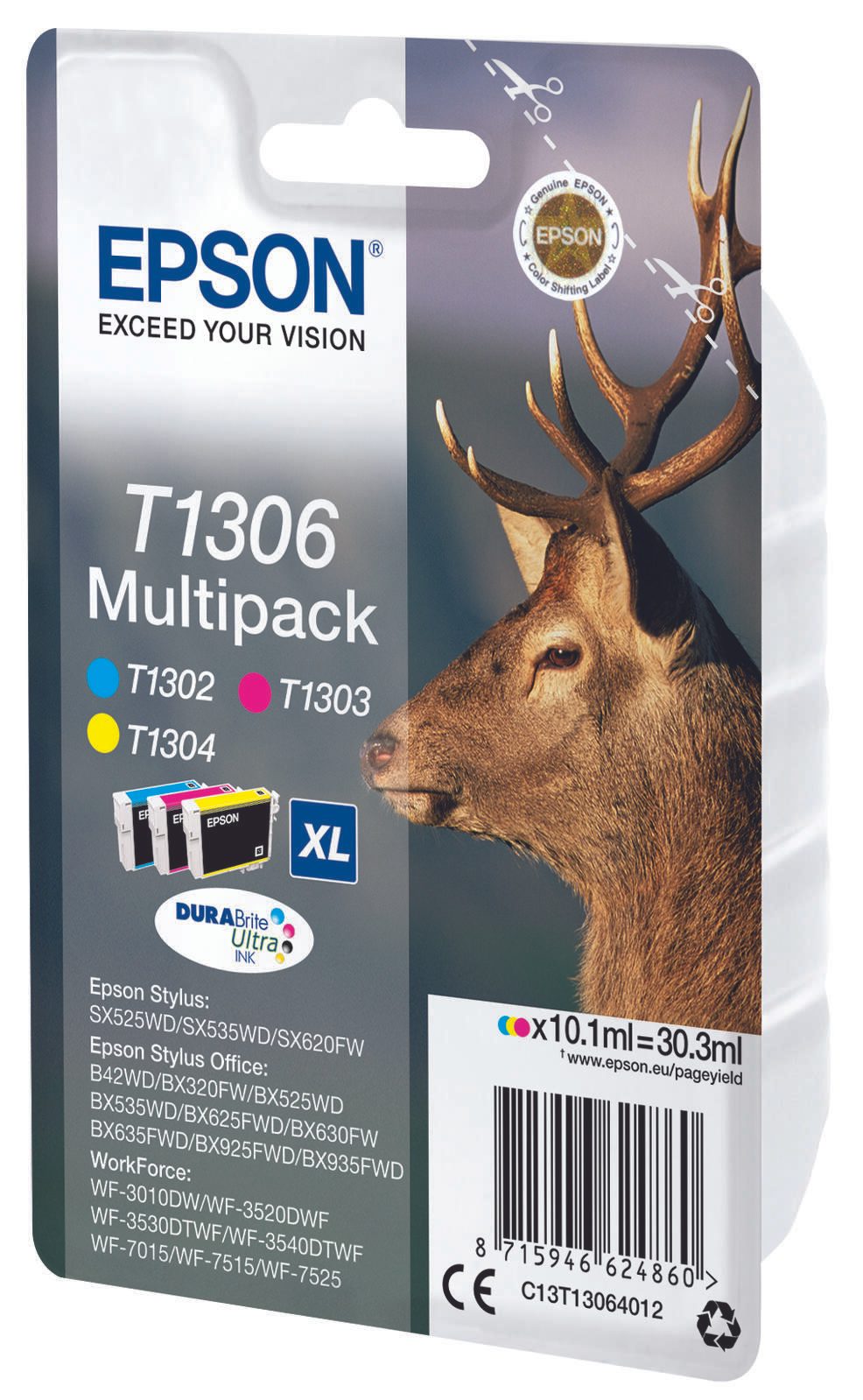 Für Epson Original T1306 Hirsch Druckerpatronen 3er Multipack C/M/Y (C13T13064012)