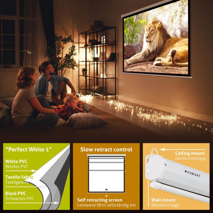 Das elegante Slimline-Oktagon-Gehäuse und das hochwertige Leinwandtuch machen dieses Produkt zur idealen Leinwand für Heimkino, Präsentation, Schule und Business.