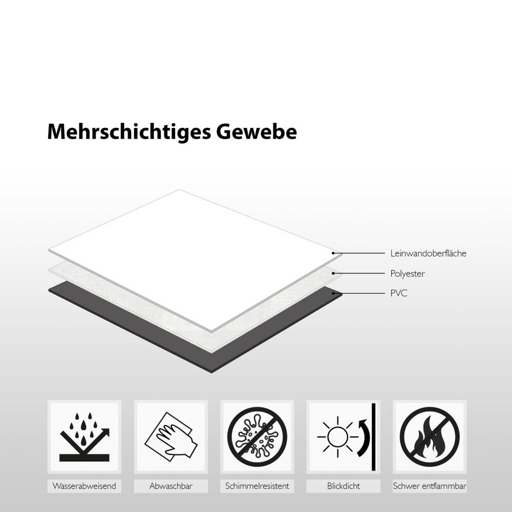 Das Leinwandtuch setzt sich aus einem 3-schichtigen Gewebe zusammen, bestehend aus einer PVC-Schicht (1), einer Polyesterschicht (2) und der Leinwandoberfläche (3).