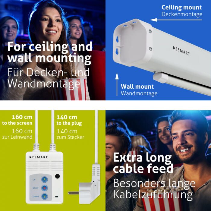 Angebracht werden kann diese elektrische Leinwand an der Decke oder an der Wand. Mithilfe des detaillierten mehrsprachigen Handbuchs ist die Montage einfach und schnell durchgeführt.