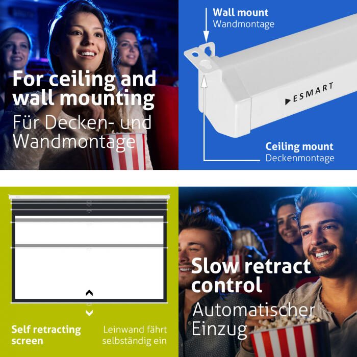 Angebracht werden kann diese Leinwand an der Decke oder an der Wand. Mithilfe des detaillierten mehrsprachigen Handbuchs ist die Montage einfach und schnell durchgeführt. Die Rollo-Leinwand lässt sich in regelmäßigen Abständen arretieren. Nach der Verwendung kann die Leinwand problemlos in das schlanke und platzsparende SlimFit-Gehäuse eingefahren werden.