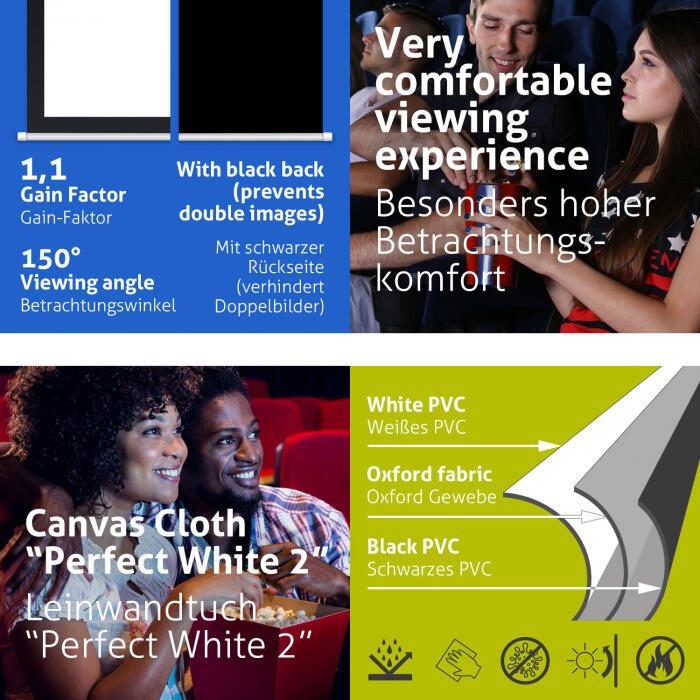 Für ein brillantes und kontrastreiches Bild sorgt der dreilagige diffus-mattweiße Leinwandstoff ESMART PerfectWhite 2. Verstärkt wird die Kontrastwahrnehmung noch durch den vollständig umlaufenden schwarzen Rand. Die schwarze Leinwandrückseite verhindert sogenannte Doppelbilder. Durch die Optimierung der Leinwandoberfläche für LED-, LCD- und DLP-Projektoren eignet sich diese Leinwand für alle privaten und geschäftlichen Anwendungen. Der hohe Betrachtungswinkel wird erreicht, indem das eintreffende Licht gleichmäßig in alle Richtungen verteilt wird. Die Projektion erscheint immer gleichmäßig ausgeleuchtet, kontrastreich und farbintensiv ohne hellere oder dunklere Stellen.