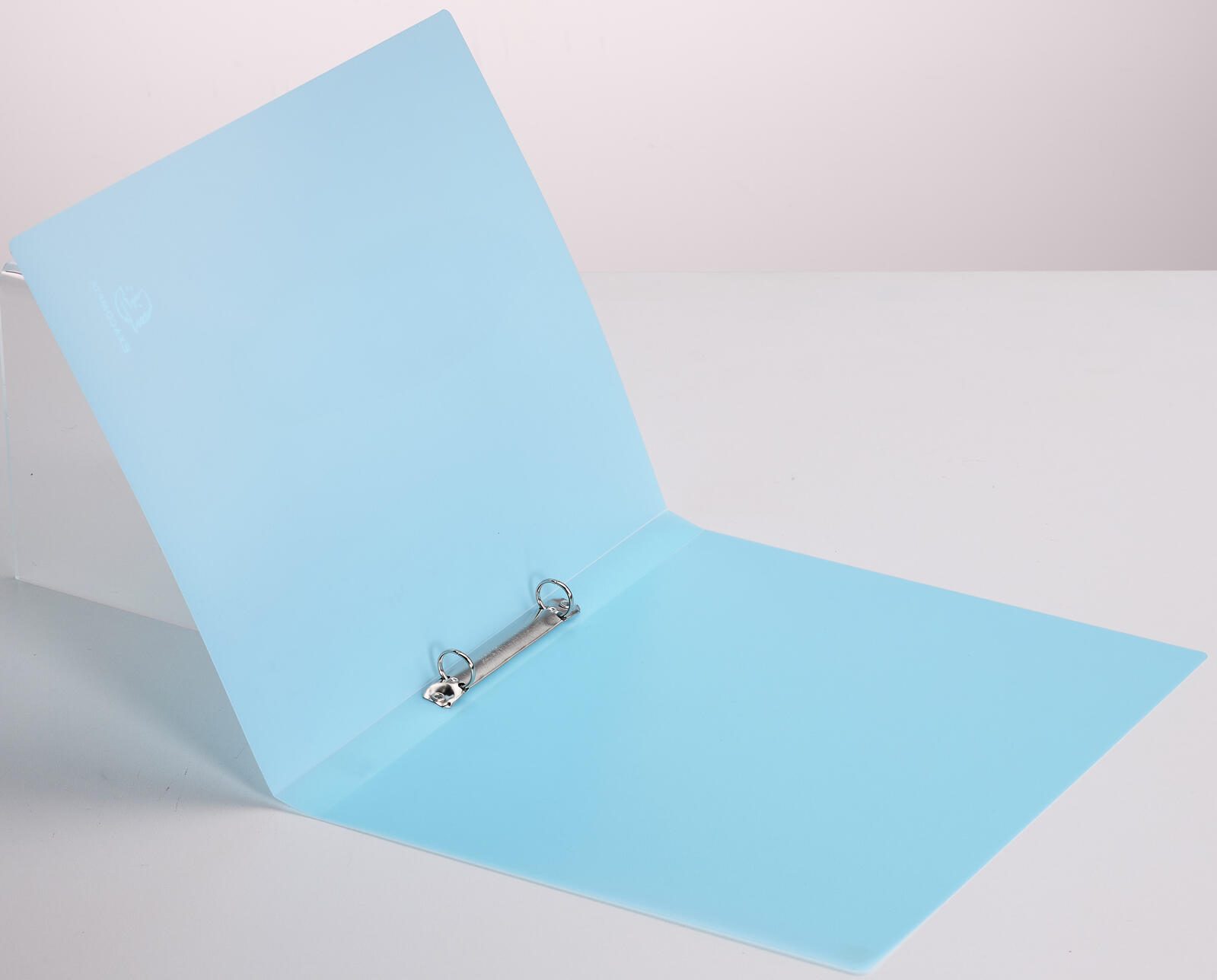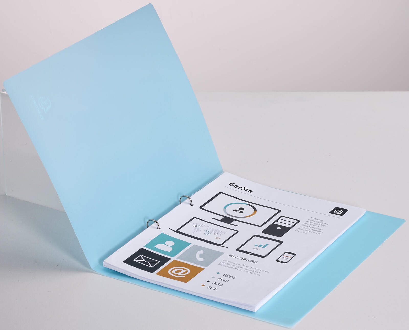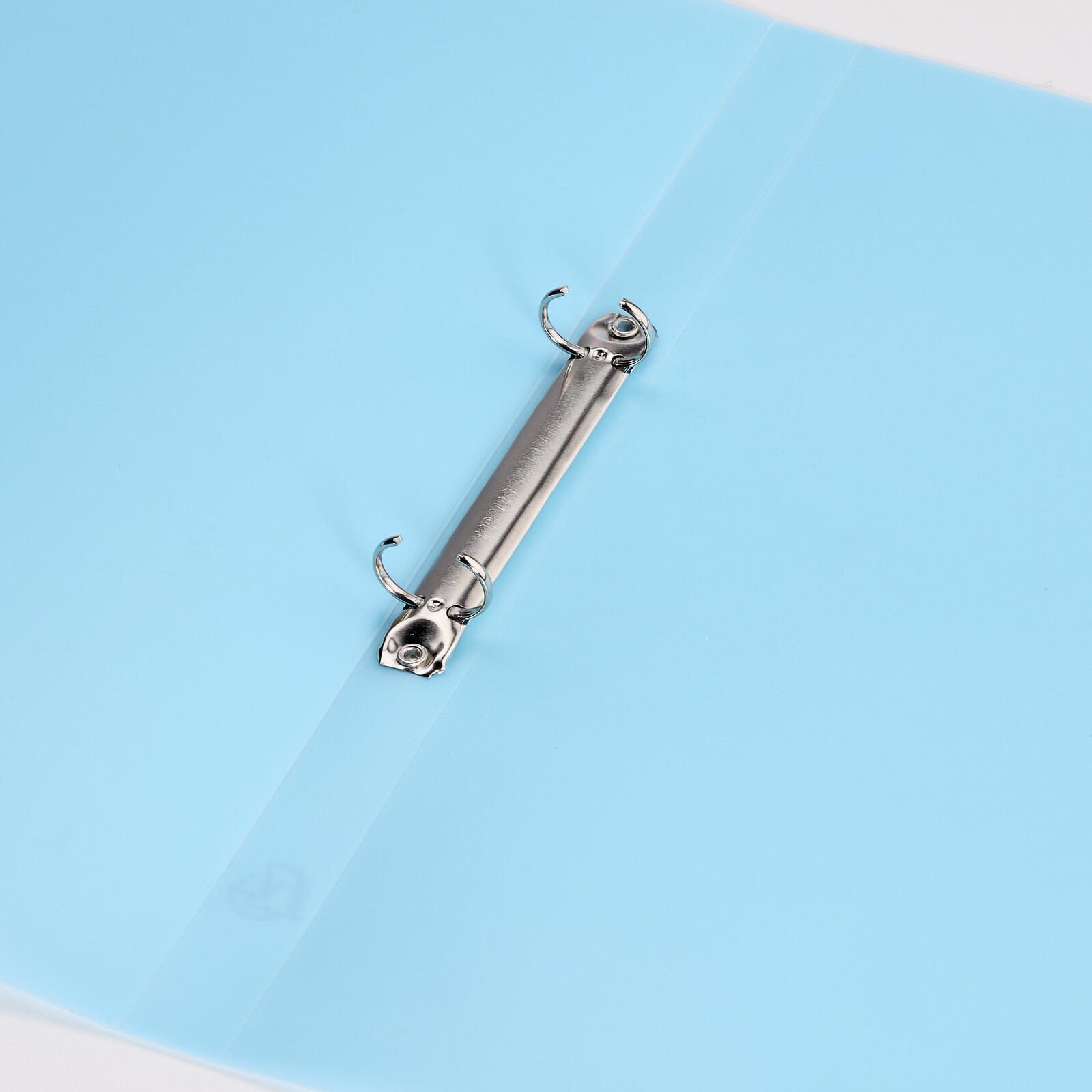 Das Ringbuch ist aus transluzentem Polypropylen (PP) gefertigt, einem robusten und langlebigen Kunststoffmaterial. Die Oberfläche ist innen und außen aus dem gleichen Material gestaltet, was eine einheitliche Optik und angenehme Haptik gewährleistet. Auf einen Niederhalter, Kantenschutz oder Einlegeformate für Rücken, Titel oder Rückseite wurde verzichtet, wodurch das Design schlicht und funktional bleibt.