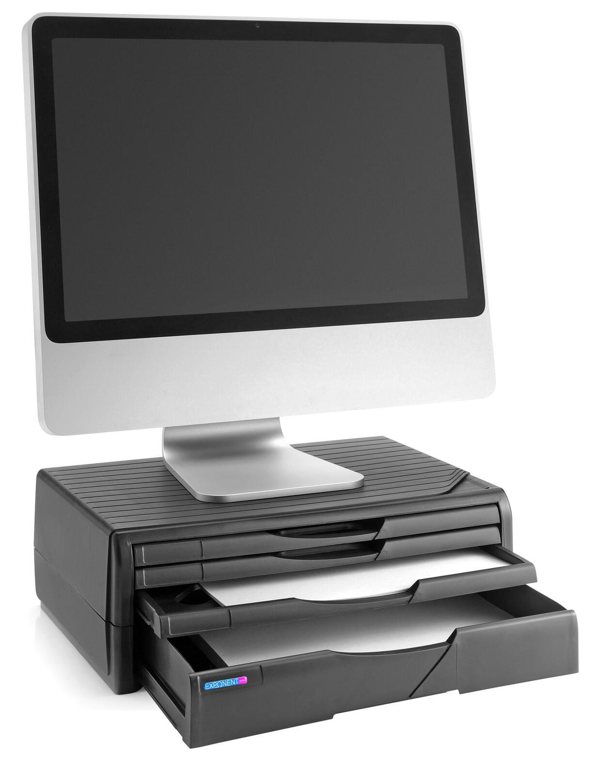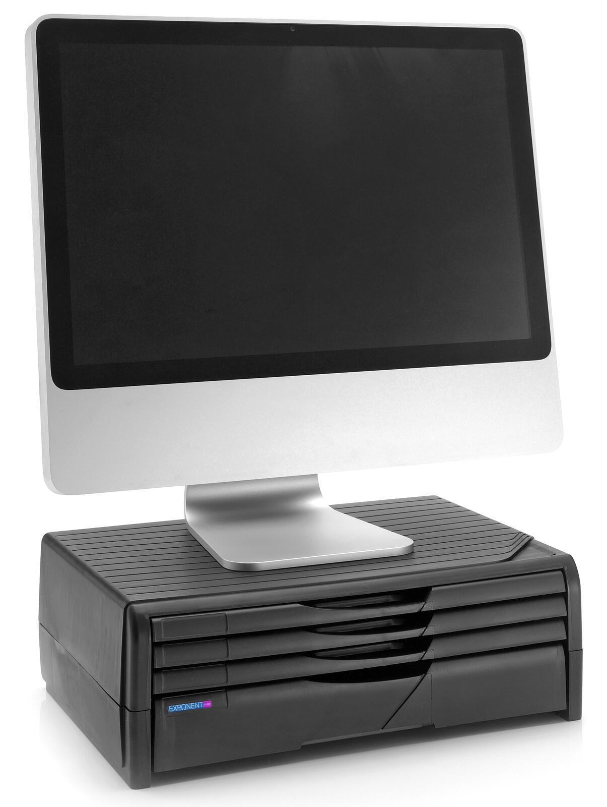 Der EXPONENT Monitorständer in elegantem Schwarz ist die ideale Lösung, um Ihren Arbeitsplatz ergonomisch zu gestalten und gleichzeitig Platz zu sparen. Hergestellt aus hochwertigem Kunststoff, bietet dieser Monitorständer eine beeindruckende Tragkraft von bis zu 20 kg, wodurch er sich sowohl für Monitore als auch für Drucker eignet. Mit seinen kompakten Abmessungen von 41,6 x 28,0 x 14,1 cm passt er problemlos auf jeden Schreibtisch und sorgt für eine optimale Bildschirmhöhe, die Nackenverspannungen vorbeugt.