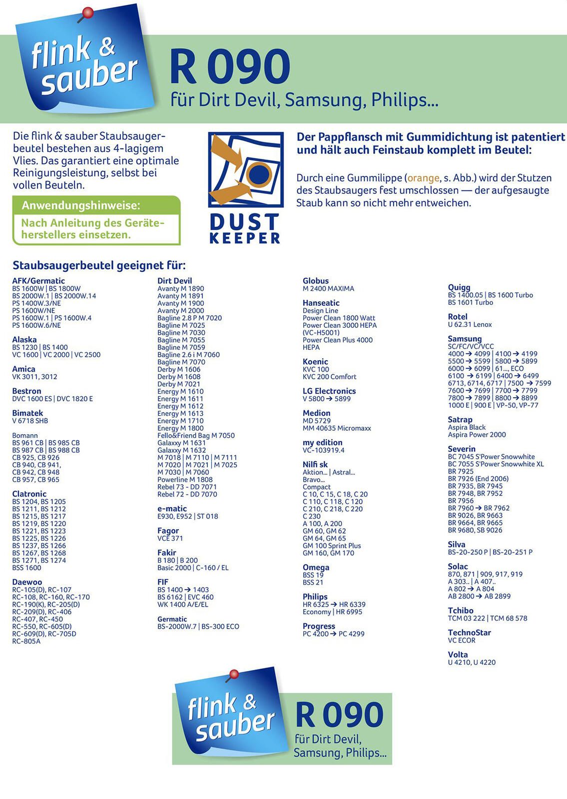 Die flink & sauber Staubsaugerbeutel sind kompatibel mit einer Vielzahl von Staubsaugermarken, darunter AFK, Germatic, Alaska, Amica, Bestron, Bimatek, Clatronic, Daewoo, Dirt Devil, e-matic, Fagor, Fakir, FIF, Globus, Hanseatic, Koenic, LG Electronics, Medion, my edition, Nilfisk, Omega, Philips, Progress, Quigg, Rotel, Samsung, Satrap und Severin. Diese Vielseitigkeit macht sie zu einer ausgezeichneten Wahl für jeden Haushalt, unabhängig von der verwendeten Marke. Du kannst dich darauf verlassen, dass diese Staubsaugerbeutel perfekt passen und eine optimale Leistung bieten.