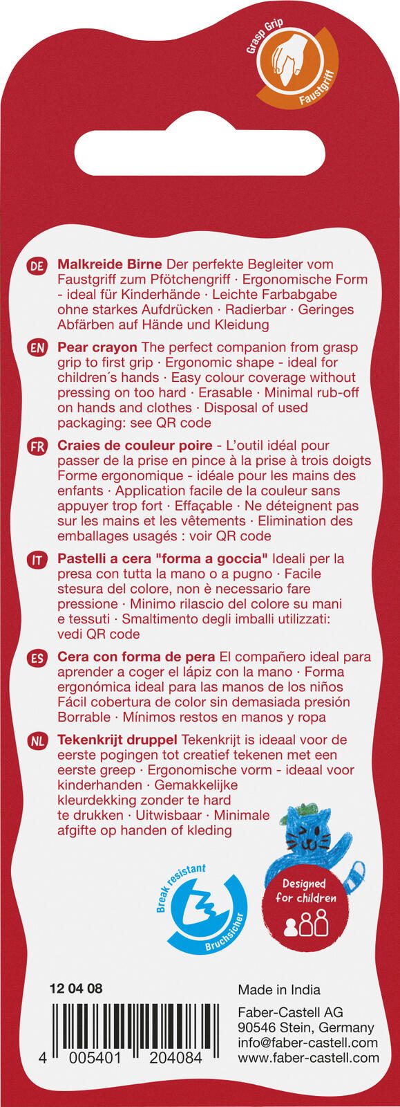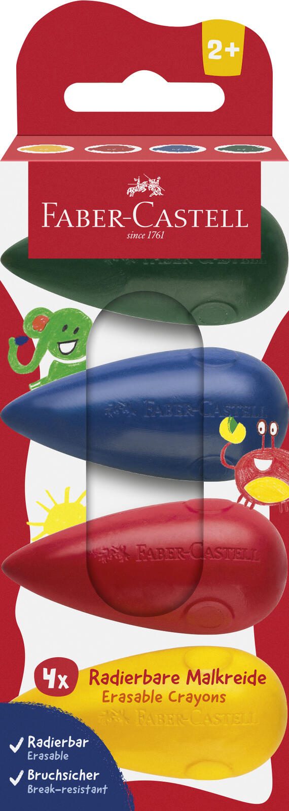 Die Malkreide Birne 4er von FABER-CASTELL zeichnet sich durch ihre brillante Farbintensität aus, die auf verschiedenen Papierarten gleichmäßig und deckend aufgetragen werden kann. Die Stifte sind Teil der bewährten Wachsmalstift-Familie von FABER-CASTELL, die für Langlebigkeit und einfache Handhabung bekannt ist.
