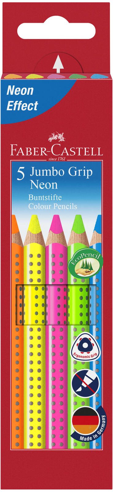 Die FABER-CASTELL Buntstifte Mehrfarbig sind die perfekte Wahl für kreative Köpfe, die Wert auf Qualität und leuchtende Farben legen. Mit einer Auswahl an fünf intensiven Neonfarben – neongelb, neonorange, neonpink, neongrün und neonblau – bringen diese Buntstifte frischen Schwung in deine Zeichnungen und Malereien. Die dreikantige Schaftform sorgt nicht nur für eine ergonomische Handhabung, sondern ermöglicht auch ein präzises und komfortables Zeichnen über längere Zeiträume. Die Jumbo-Ausführung dieser Farbstifte bietet eine optimale Farbdeckung und ist ideal für große Flächen, während die bruchfeste Mine durch eine spezielle Verleimung besonders langlebig ist. So kannst du dich ganz auf deine Kreativität konzentrieren, ohne dir Gedanken über ständig brechende Spitzen machen zu müssen. Verpackt in einem praktischen Karton-Etui, sind die fünf Buntstifte nicht nur ein ideales Geschenk für Kinder und Künstler, sondern auch ein unverzichtbares Werkzeug für jeden, der gerne malt oder zeichnet. Egal, ob du in der Schule, im Büro oder in deiner Freizeit kreativ bist, die FABER-CASTELL Buntstifte bieten dir die Möglichkeit, deine Ideen lebendig werden zu lassen. Mit diesen hochwertigen Buntstiften von FABER-CASTELL kannst du deine Kunstwerke mit strahlenden Farben zum Leben erwecken und deine Kreativität auf ein neues Level heben. Sie sind nicht nur für den Einsatz auf Papier geeignet, sondern auch perfekt für kreative Projekte auf verschiedenen Oberflächen. Erlebe die Freude am Malen und Zeichnen mit den FABER-CASTELL Buntstiften Mehrfarbig und entdecke die Vielfalt, die diese Stifte bieten.Technische Daten