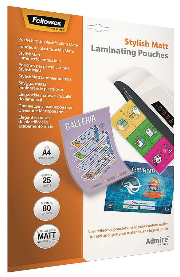 Die Fellowes Laminierfolien matt 80 mikron A4 bieten eine hervorragende Möglichkeit, Dokumente und Bilder professionell zu schützen und aufzuwerten. Diese hochwertigen Folien sind ideal für die Laminierung von A4-Formaten und sorgen für eine matte Oberfläche, die nicht nur ansprechend aussieht, sondern auch Fingerabdrücke und Glanzreflexionen minimiert. Mit einer Folienstärke von 80 Mikron pro Seite garantieren sie eine optimale Stabilität und Langlebigkeit deiner laminierte Materialien. Jede Packung enthält 25 Stück, was sie zu einer praktischen Wahl für den täglichen Gebrauch im Büro oder zu Hause macht. Die abgerundeten Ecken der Folien verhindern ein Abblättern und sorgen für eine ansprechende Optik. Hergestellt aus hochwertigem Polyester (PET) und Ethyl-Vinyl-Acetat (EVA), sind die Laminierfolien nicht nur robust, sondern auch einfach in der Anwendung. Die Fellowes Laminierfolien sind eine ausgezeichnete Wahl für alle, die Wert auf Qualität und Präsentation legen. Egal, ob du wichtige Dokumente, kreative Bastelarbeiten oder Erinnerungsfotos laminieren möchtest, diese Folien bieten den idealen Schutz und verleihen deinen Materialien eine professionelle Note. Die Verwendung dieser Laminierfolien sorgt dafür, dass deine Dokumente vor Feuchtigkeit, Schmutz und Abnutzung geschützt sind, wodurch ihre Lebensdauer erheblich verlängert wird. Mit der Entscheidung für Fellowes Laminierfolien matt 80 mikron A4 investierst du in Qualität und Schutz, die deine Dokumente in einem perfekten Zustand halten.Technische Daten
