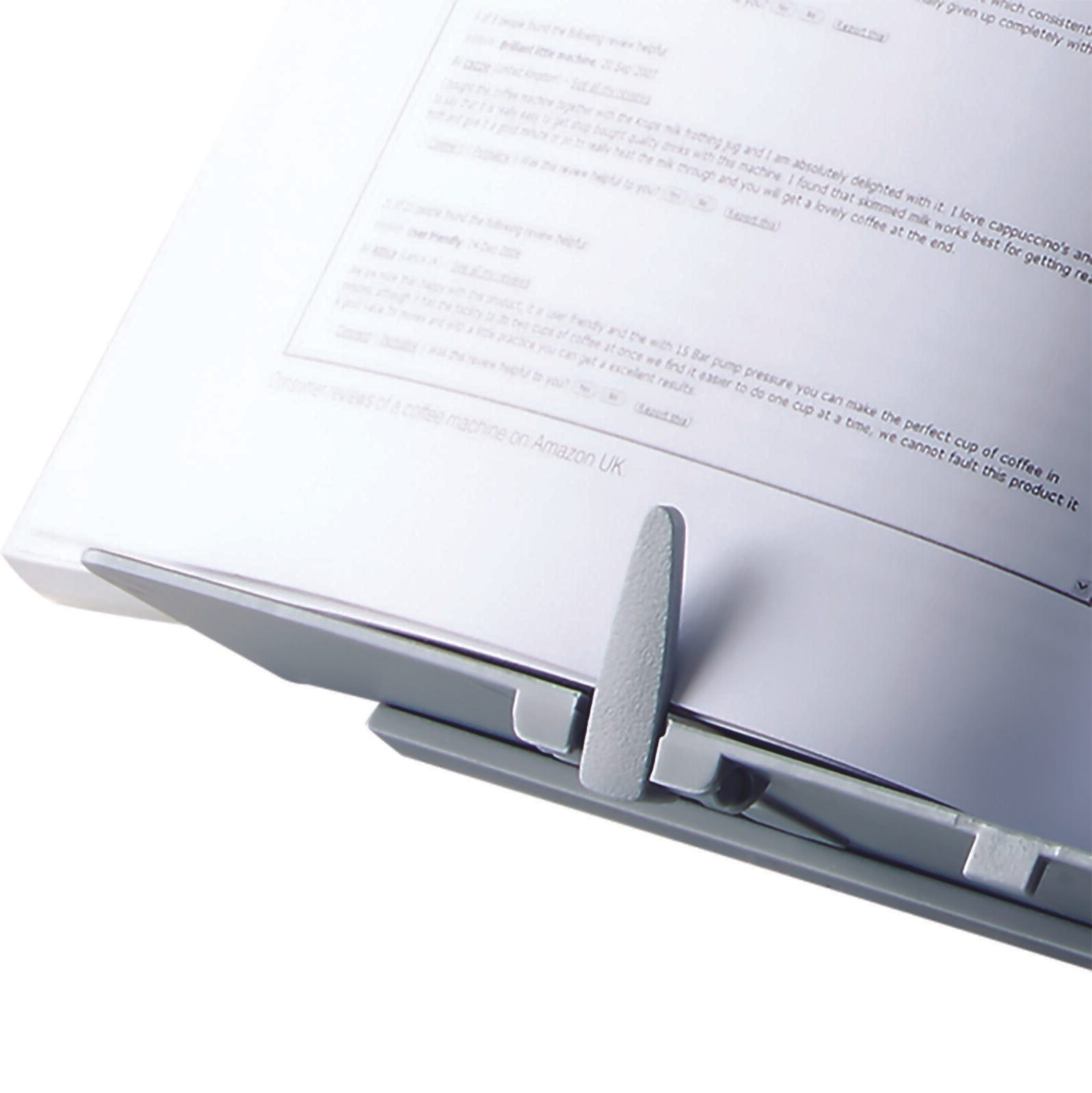 Hergestellt aus hochwertigem Kunststoff, zeichnet sich der Konzepthalter durch seine Langlebigkeit und einfache Handhabung aus. Die silberne Farbe verleiht ihm ein modernes und stilvolles Aussehen, das sich harmonisch in jede Büroeinrichtung integriert. Ein besonderes Merkmal dieses Produkts sind die zwei verstellbaren Seitenclips, die es Ihnen ermöglichen, Ihre Seiten sicher zu fixieren. So bleibt Ihr Dokument stets an Ort und Stelle, während Sie bequem lesen oder Notizen machen.