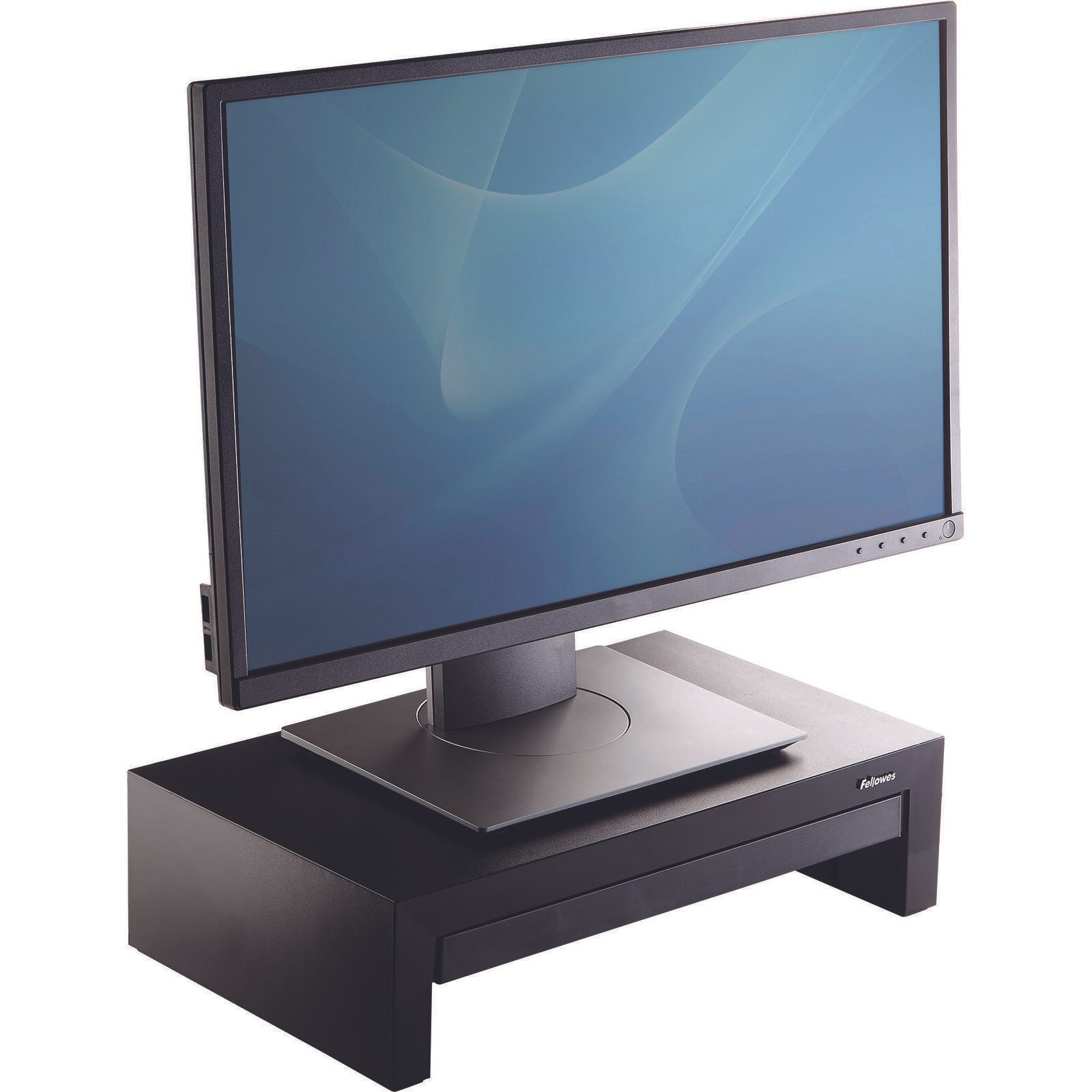 Der Fellowes Monitorständer in elegantem Schwarz ist die ideale Lösung, um Ihren Arbeitsplatz ergonomisch zu gestalten. Hergestellt aus hochwertigem ABS-Kunststoff, vereint dieser Monitorständer Funktionalität und modernes Design. Mit einer Tragkraft von bis zu 18 kg ist er robust genug, um die meisten Monitore sicher zu halten. Die kompakten Abmessungen von 40,7 cm in der Breite, 23,8 cm in der Tiefe und einer variablen Höhe von 11,1 bis 15,0 cm ermöglichen es Ihnen, den Monitor auf die perfekte Sichthöhe einzustellen, was die Belastung von Nacken und Augen reduziert.