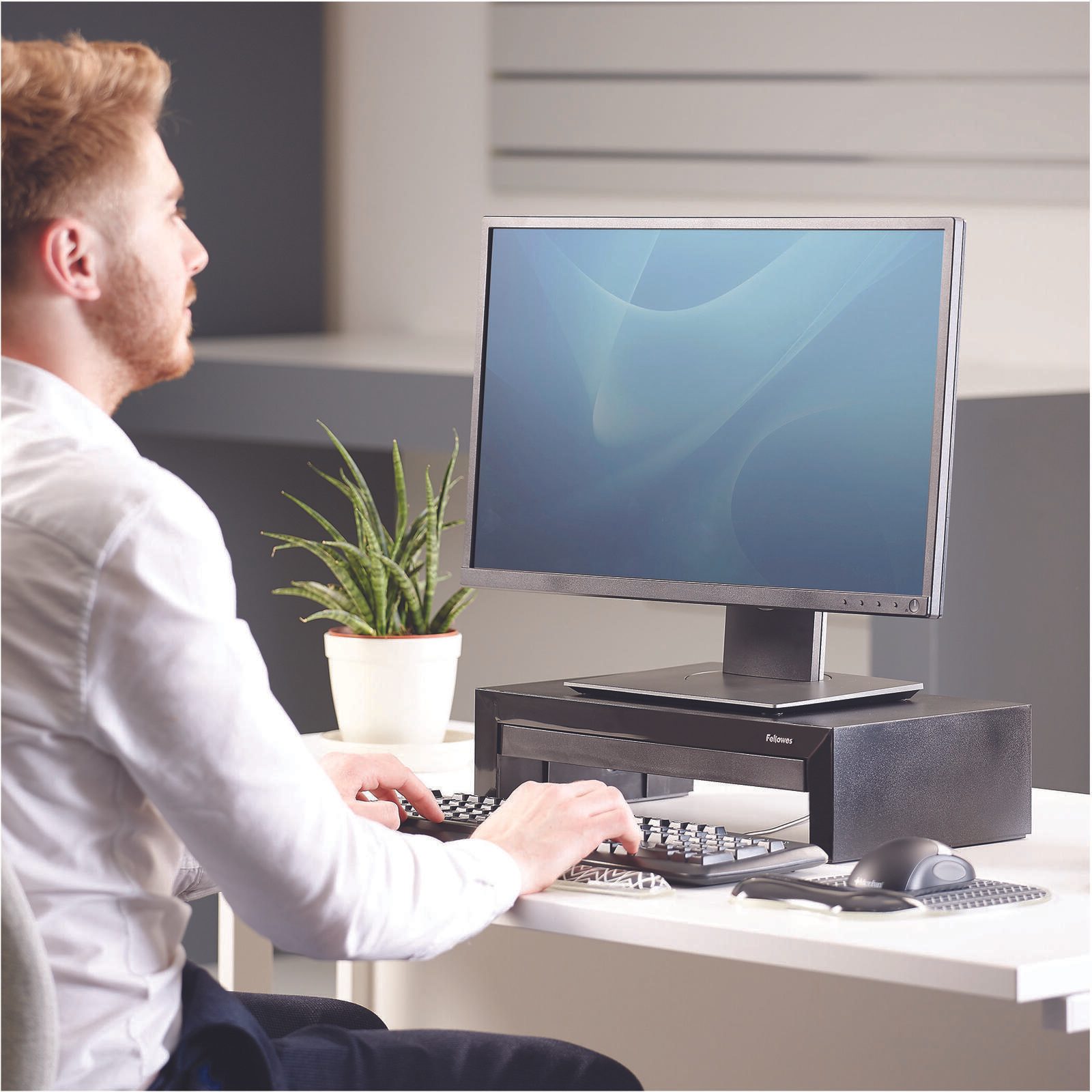 Ein herausragendes Merkmal des Fellowes Monitorständers ist seine Höhenverstellbarkeit, die sich leicht an Ihre individuellen Bedürfnisse anpassen lässt. Dies ist besonders vorteilhaft für lange Arbeitsstunden, da eine ergonomische Bildschirmposition die Produktivität steigert und gleichzeitig das Risiko von Beschwerden verringert. Die schlichte schwarze Farbe fügt sich nahtlos in jede Büroumgebung ein und sorgt für ein aufgeräumtes Erscheinungsbild.