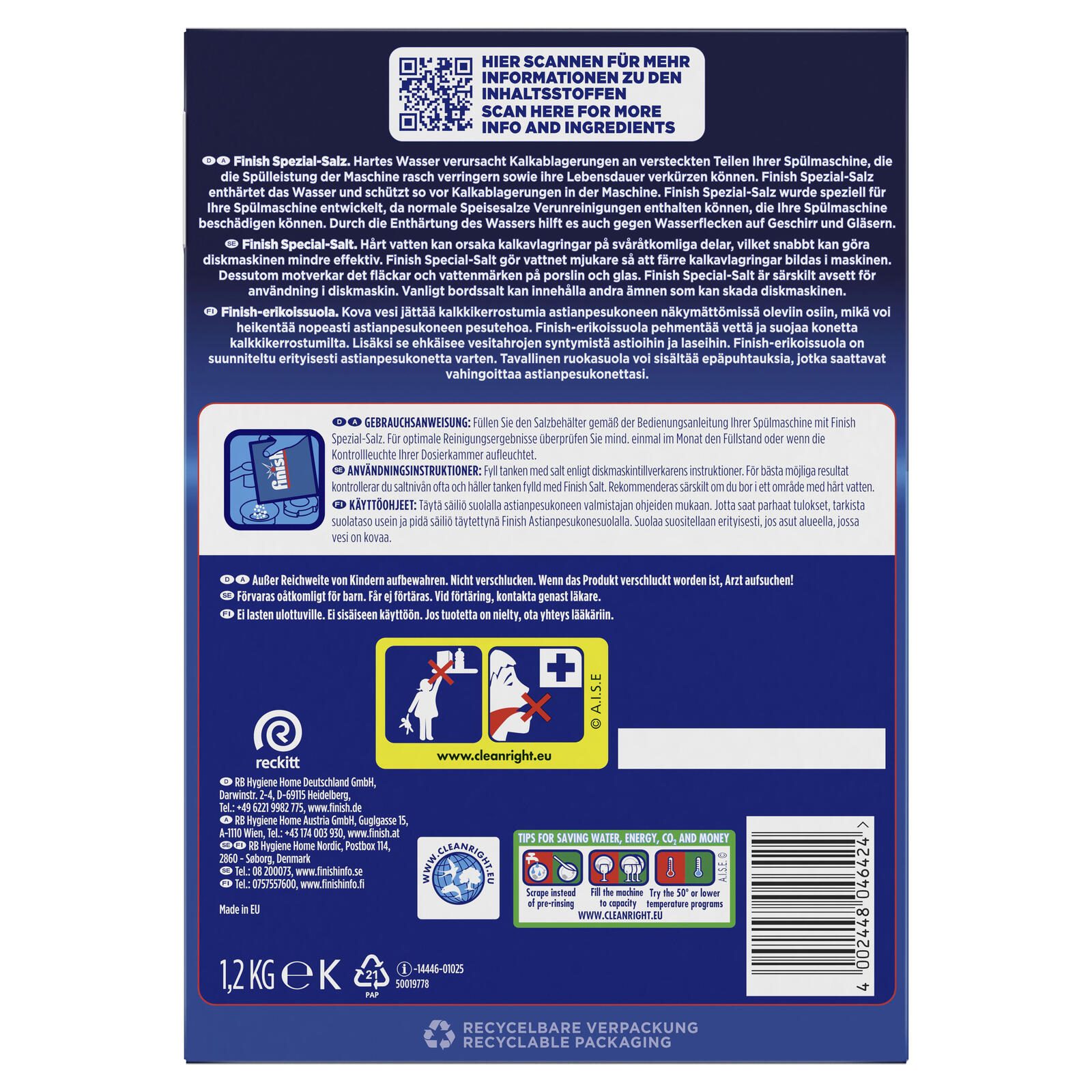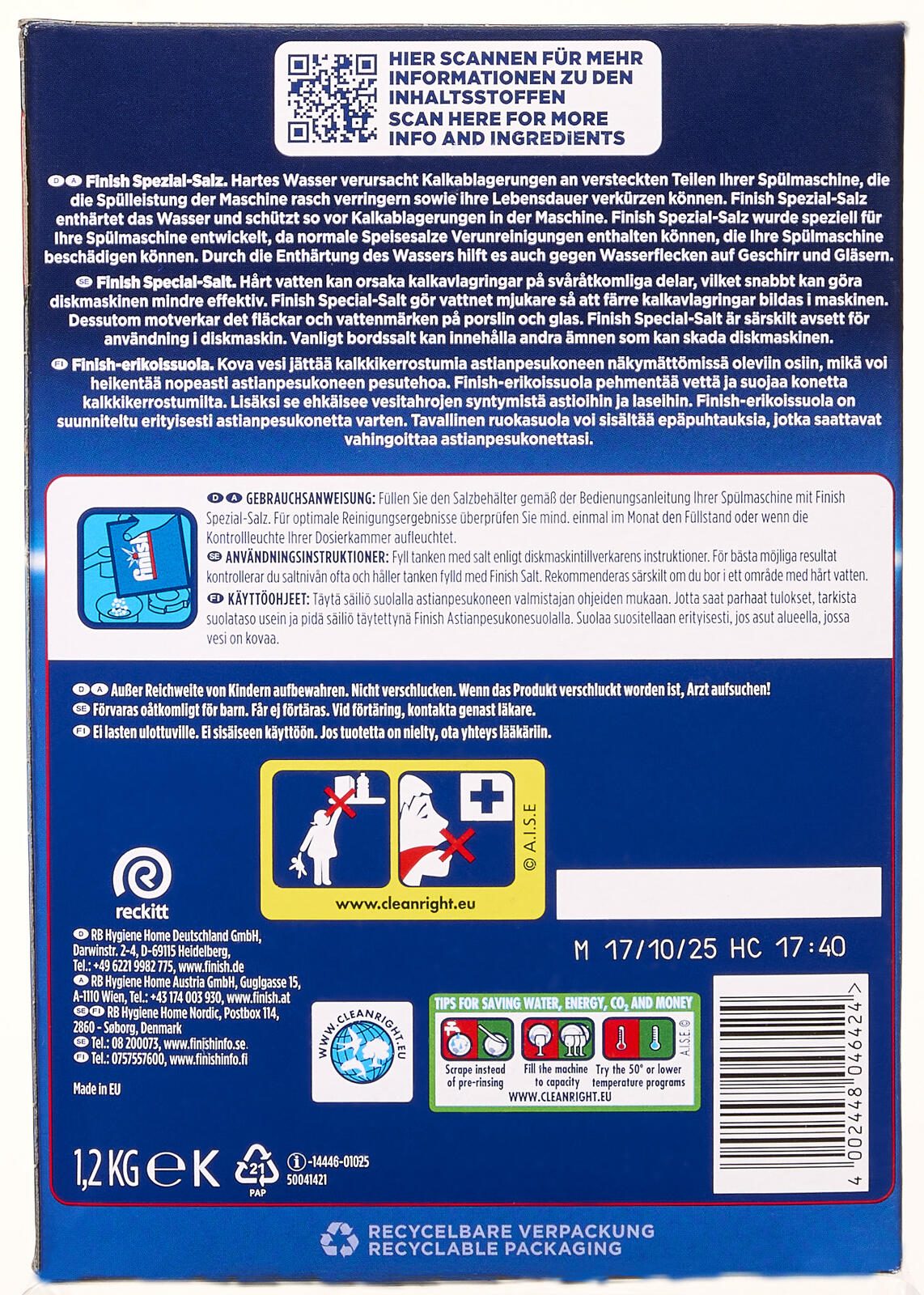 Das Finish Spezial-Salz 1,2 kg ist die ideale Lösung für alle, die ihre Spülmaschine optimal schützen und die Lebensdauer ihrer Geräte verlängern möchten. Dieses hochwertige Spülmaschinensalz von Calgonit Finish sorgt für einen effektiven Kalkschutz und trägt dazu bei, dass dein Geschirr strahlend sauber und glänzend aus der Maschine kommt. Mit einer Packungsgröße von 1,2 kg ist es perfekt für den regelmäßigen Gebrauch in deinem Haushalt geeignet.