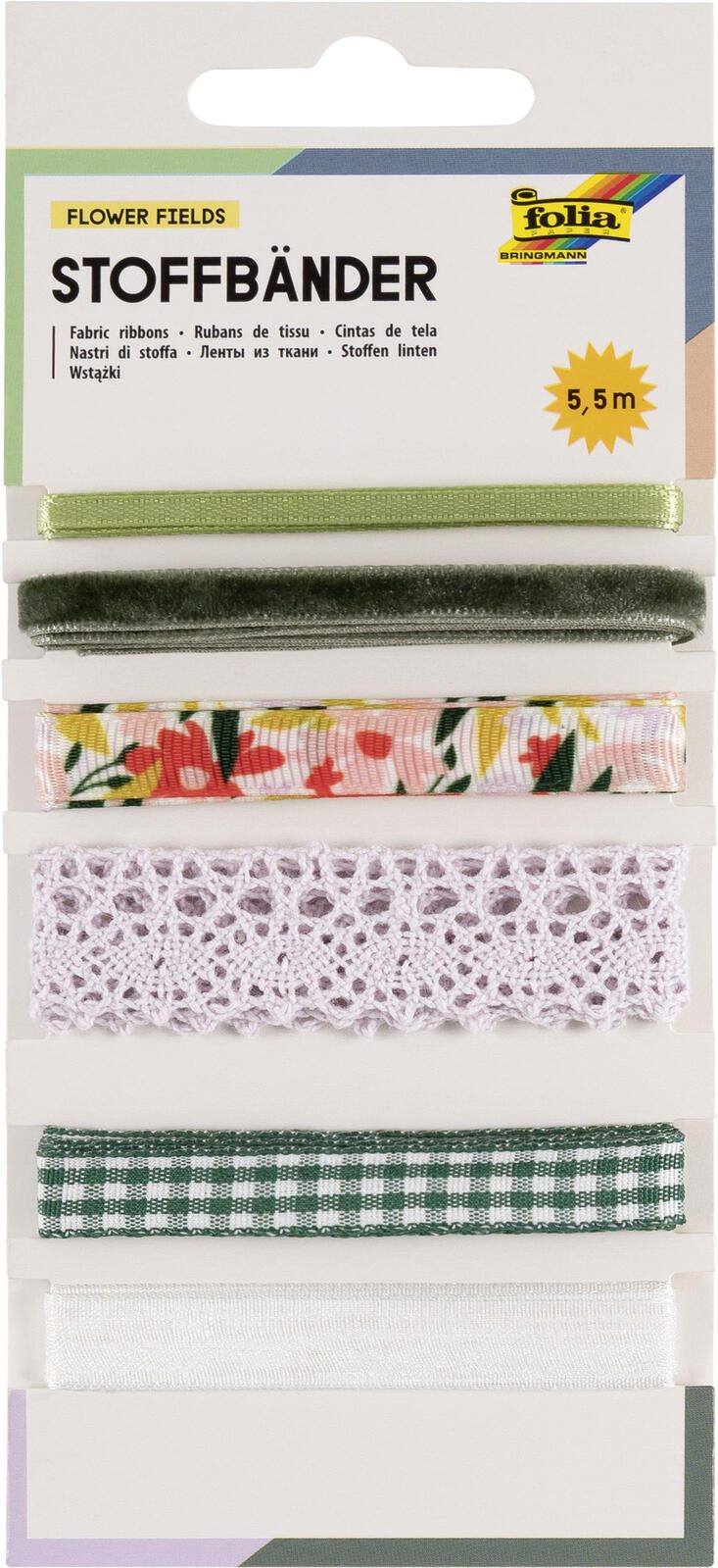 Die folia Geschenkbänder Flower Fields in grün/weiß sind die perfekte Wahl, um deine Geschenke stilvoll zu verpacken. Jedes Set enthält 6 Bänder in verschiedenen Ausführungen, darunter je ein Satinband, Samtband, Häkelspitze, Chiffonband sowie zweimal bedruckte Stoffbänder. Dank ihres hochwertigen Materials aus Stoff sind diese Bänder langlebig und verleihen deinen Geschenken eine besondere Note.